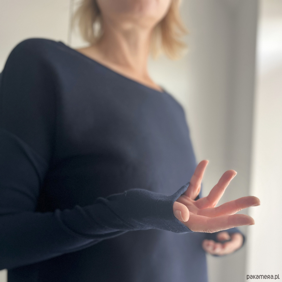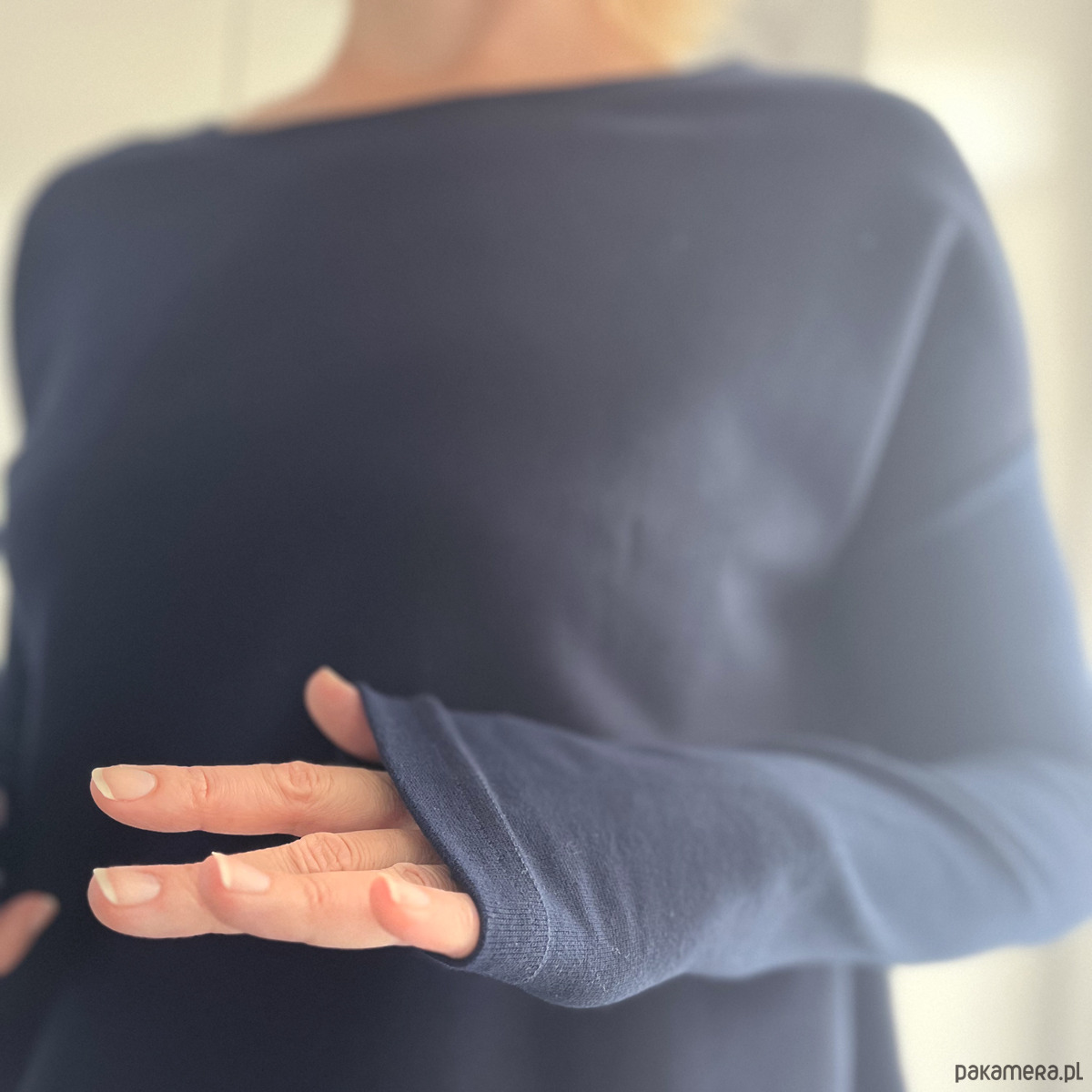 Rękawy są z cienkiej dzianiny ściągaczowej – długie, wygodne, trochę jakby stworzone do tego, żeby je naciągać na dłonie przy kubku herbaty.