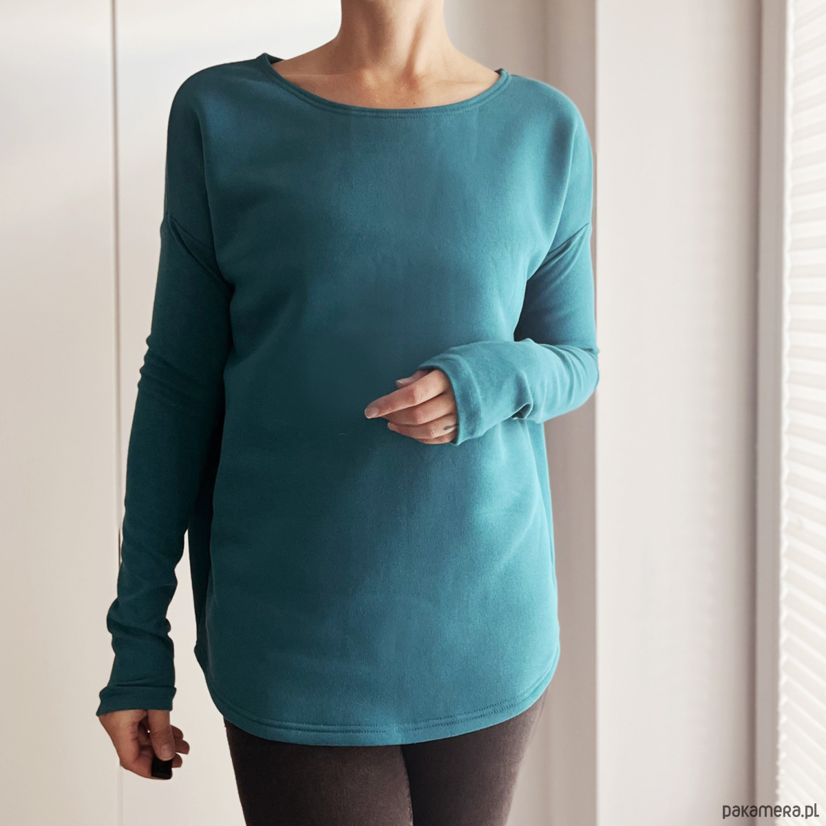 Bez zbędnych ozdobników, po prostu dobra bluza — gruba dresówka, długie rękawy, czysta forma.