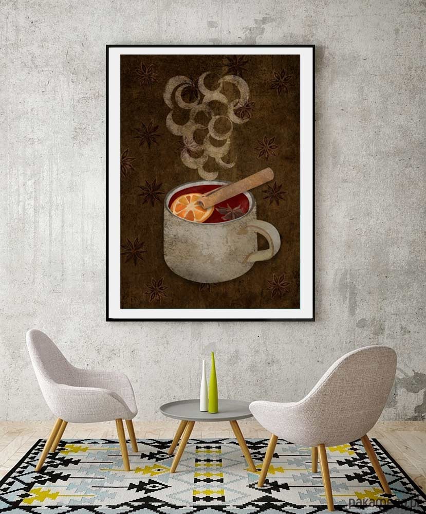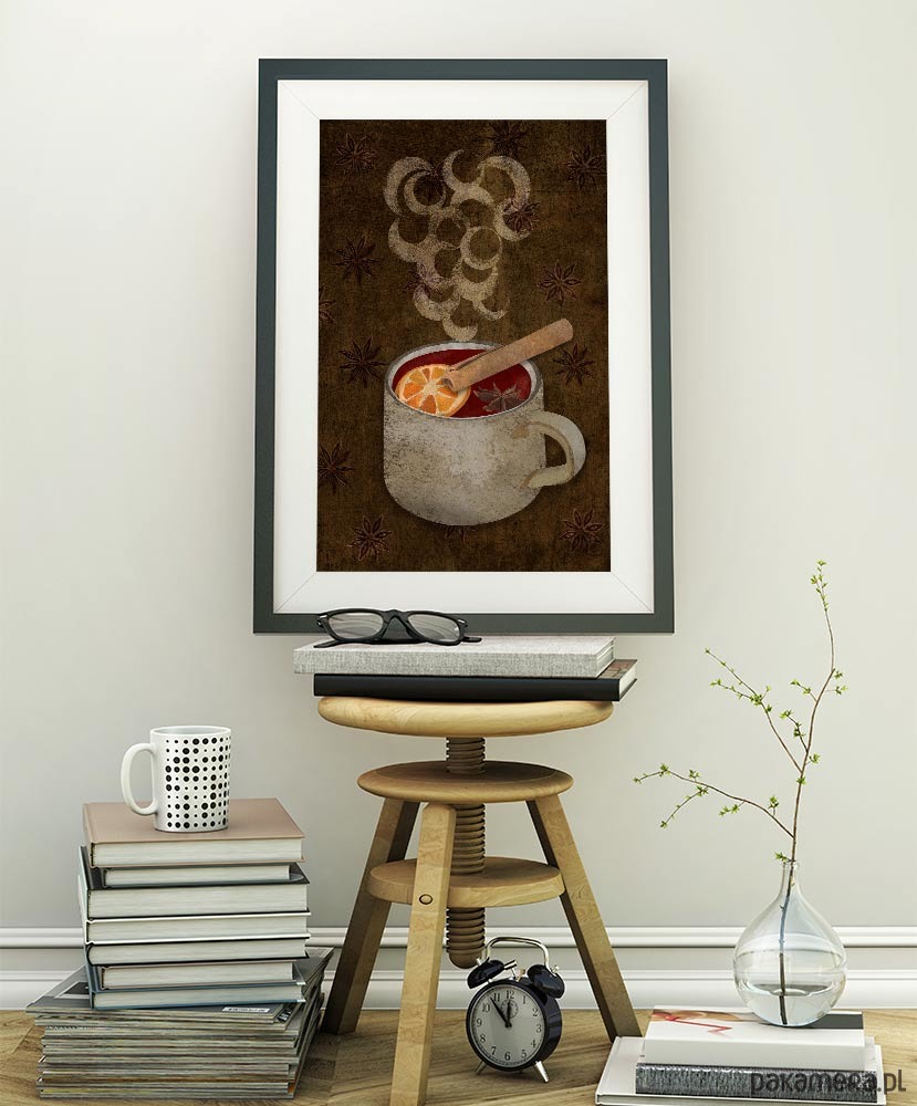Plakat z autorską grafiką przedstawiającą parujący kubek pełen grzanego wina z cynamonem i pomarańczą. W polskiej piosence z lat 70-tych było już "małe piwko z korzeniami", teraz czas na grzane wino z przyprawami. Plakat utrzymany w stylistyce retro idealnie sprawdzi się na ścianie kuchni, bądź jadalni. Zaprojektowany przez pracownię Mayam posters.