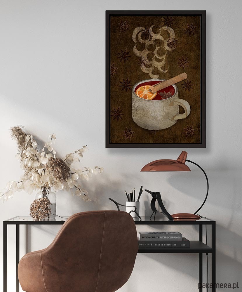 Plakat z autorską grafiką przedstawiającą parujący kubek pełen grzanego wina z cynamonem i pomarańczą. W polskiej piosence z lat 70-tych było już "małe piwko z korzeniami", teraz czas na grzane wino z przyprawami. Plakat utrzymany w stylistyce retro idealnie sprawdzi się na ścianie kuchni, bądź jadalni.