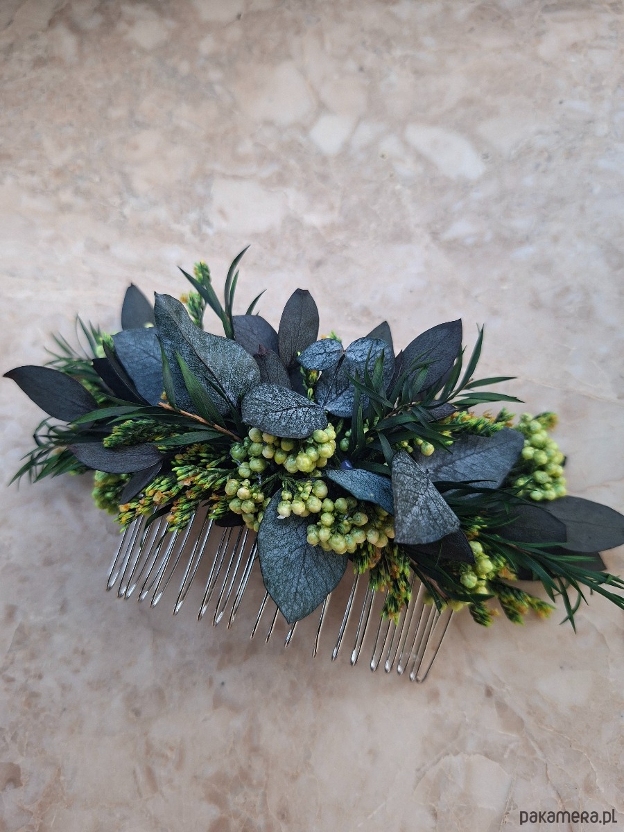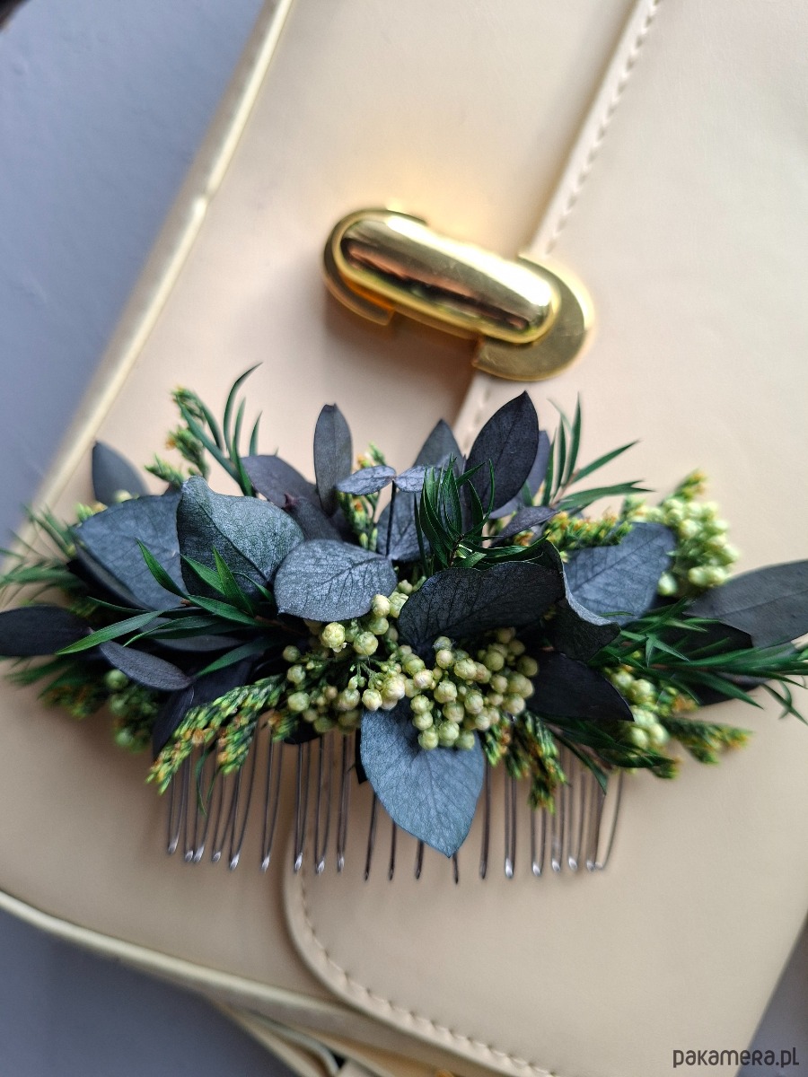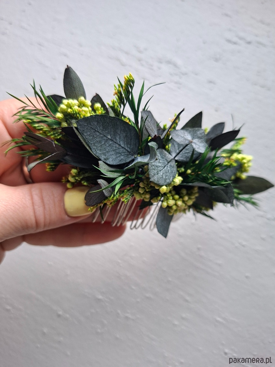 Grzebień do włosów wykonany stabilizowanego eukaliptusa i limoniuma,kwiaty ryżu, drzewo herbaciane.