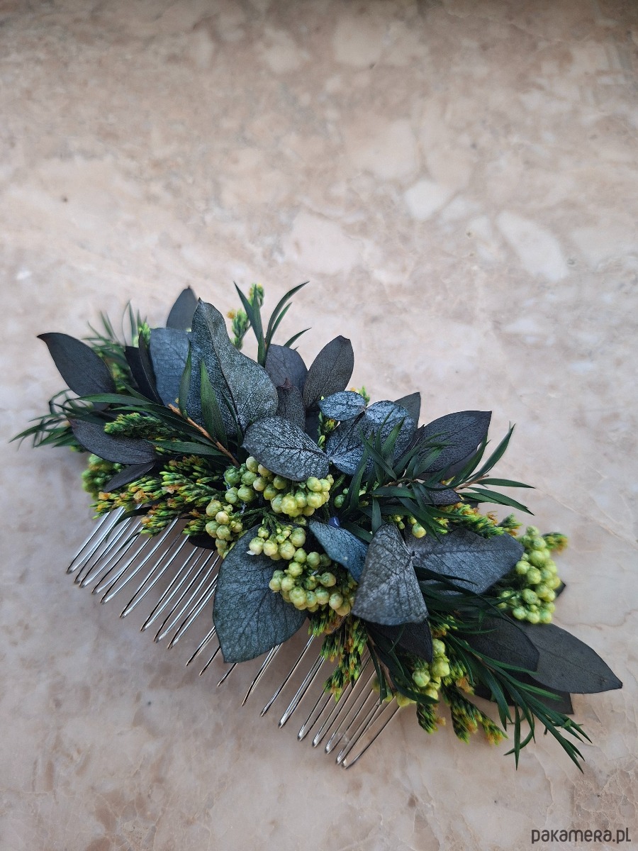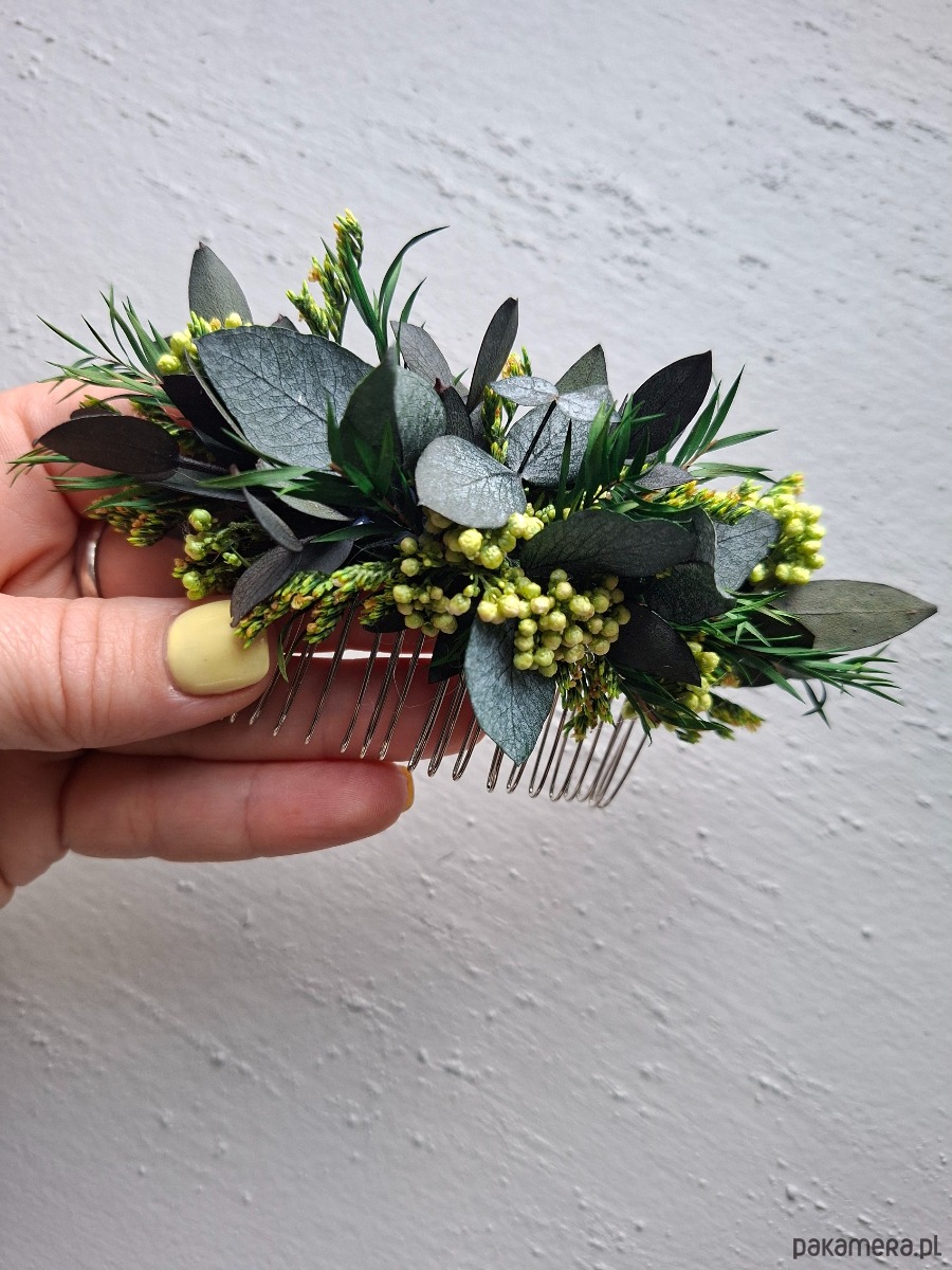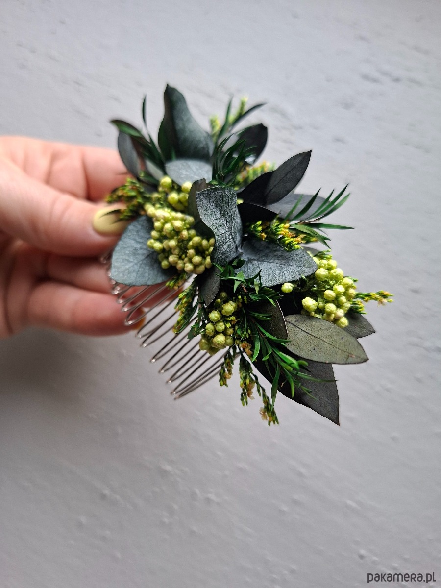 Grzebień do włosów wykonany stabilizowanego eukaliptusa i limoniuma,kwiaty ryżu, drzewo herbaciane.