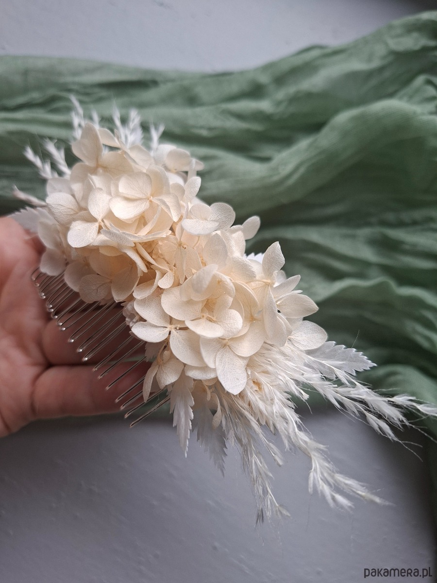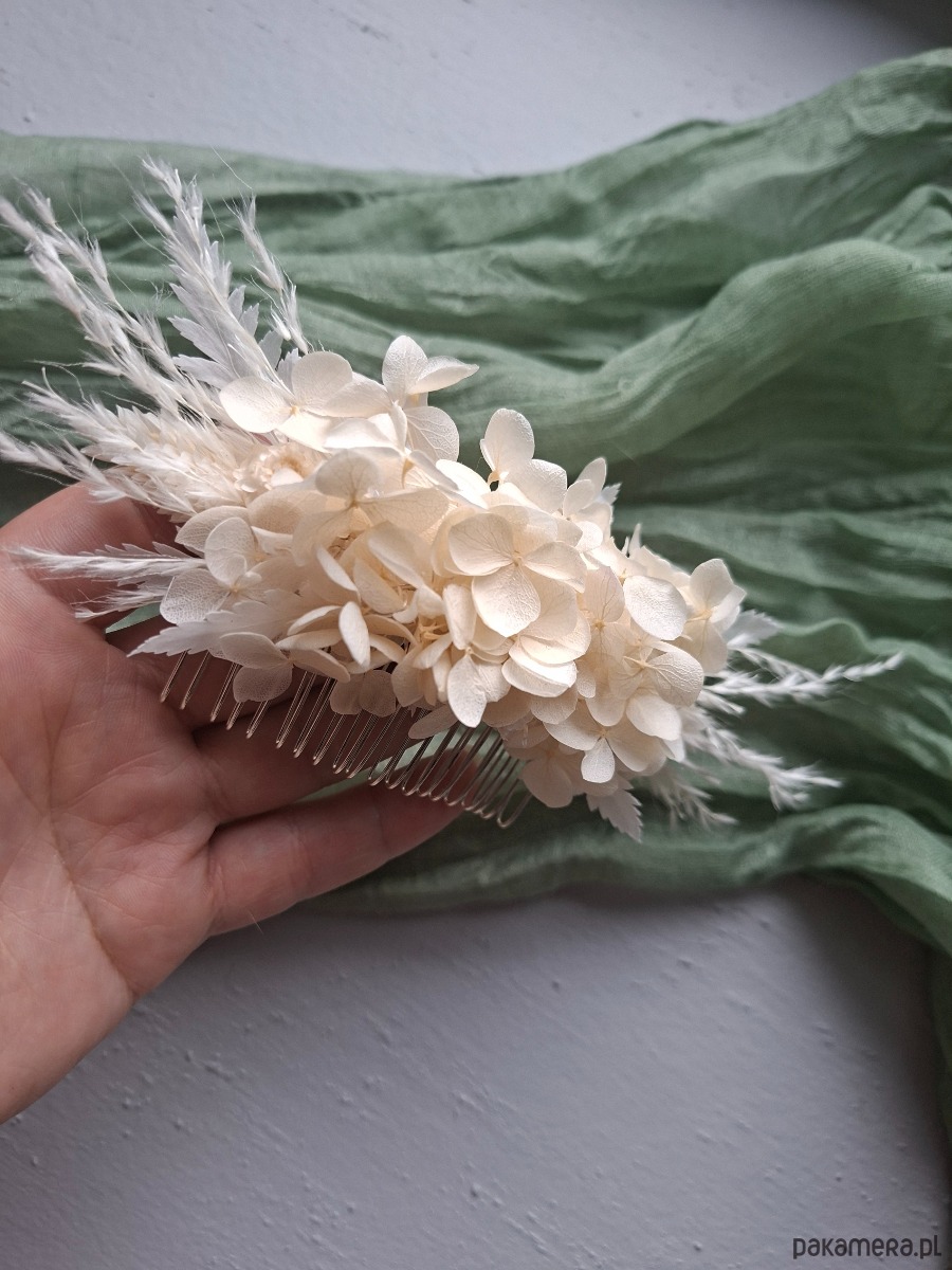 Grzebień z suszonych kwiatów będzie doskonałym dodatkiem do stylizacji na wesele, imprezę, sesję zdjęciową, studniówkę, druhny i inne imprezy.