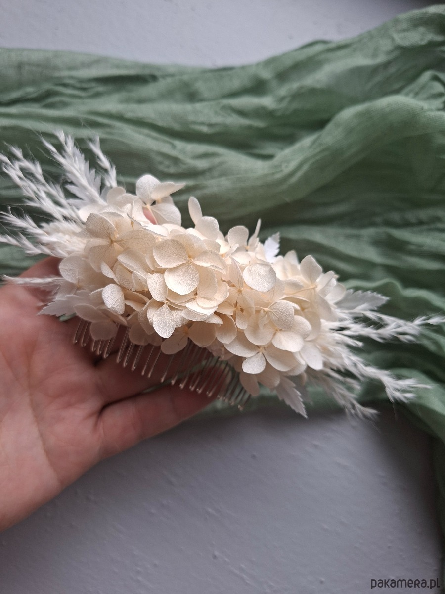 Grzebień do włosów wykonany z kość słoniowa stabilizowany hortensji,to idealny dodatek do stworzenia romantycznej atmosfery.