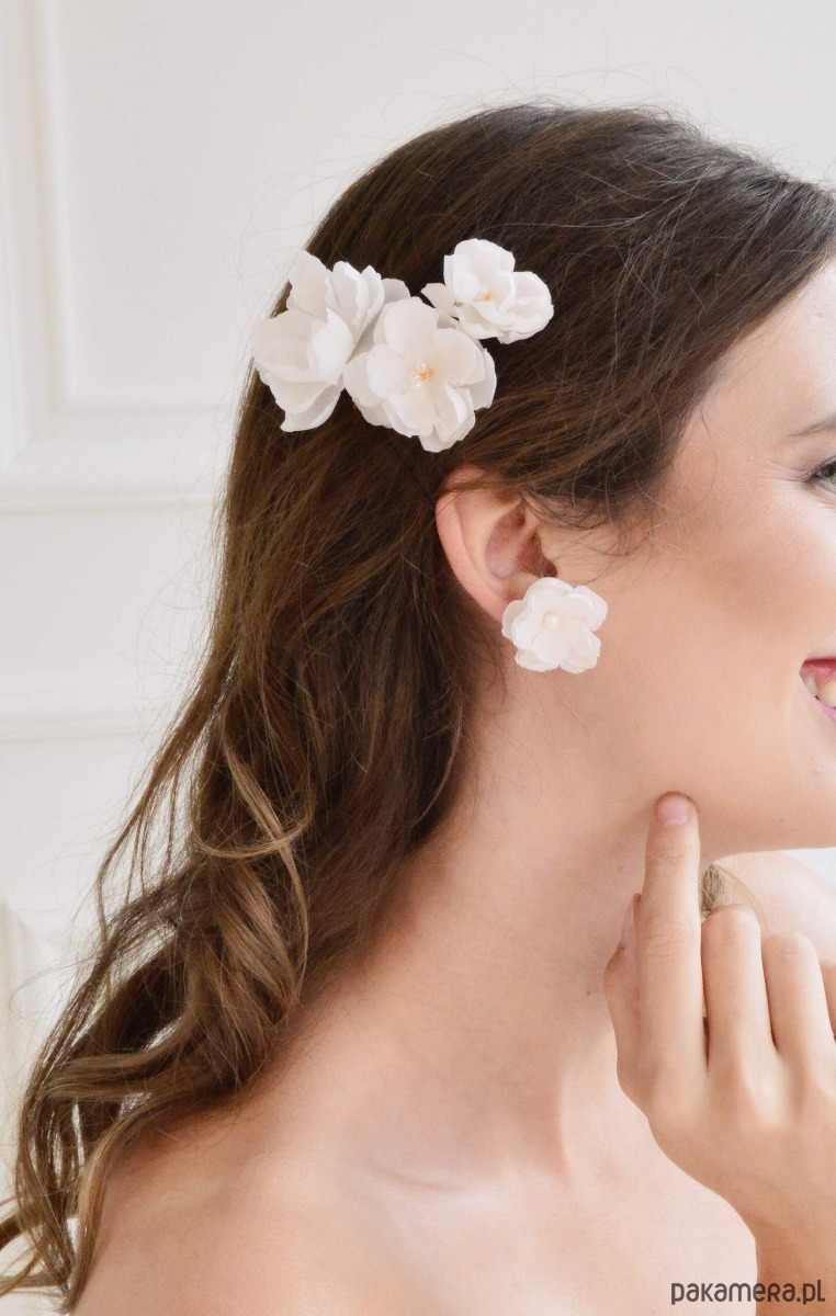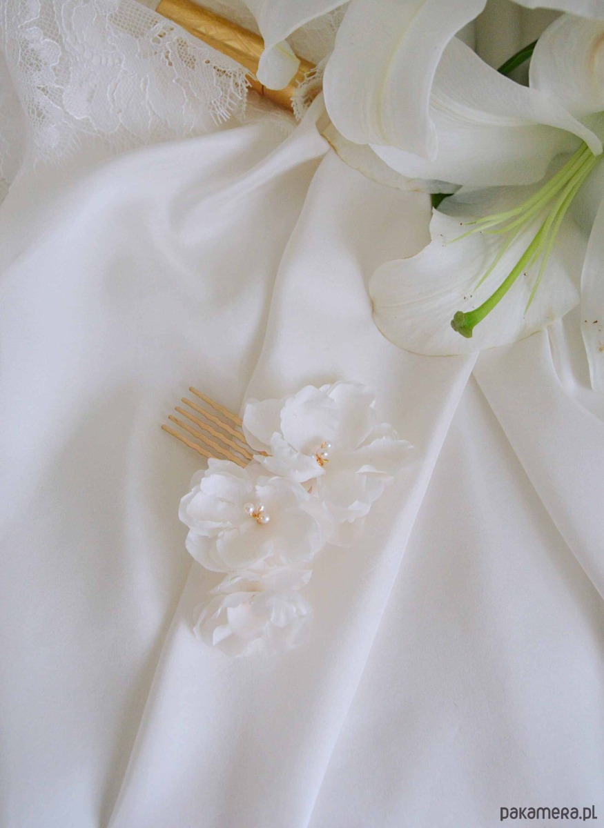 Grzebyk IDA wykonany z ręcznie formowanych kwiatków z jedwabiu w kolorze ivory, perełek Swarovskiego. Długość 9 cm. Mocowany na giętkim, metalowym grzebyku, wyplatany odpornym na ścieranie druciku amerykańskiego. Możliwość wykonania innego rozmiaru.