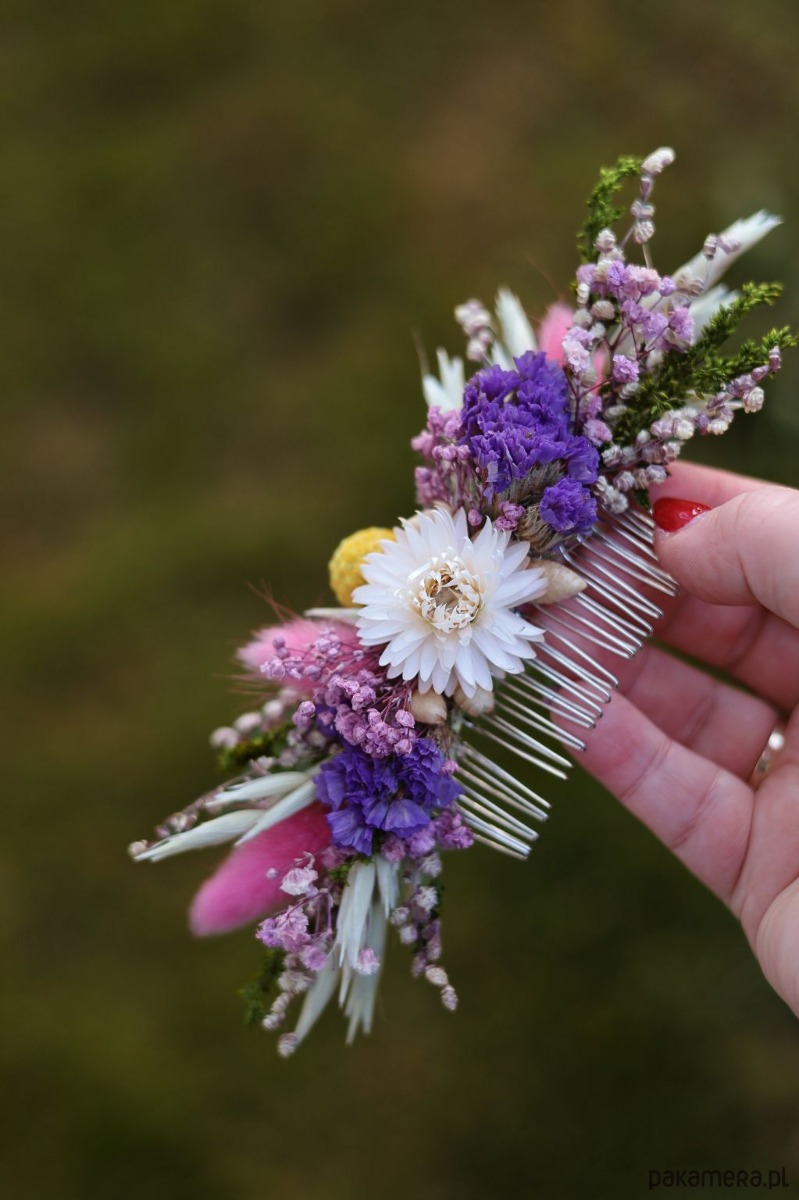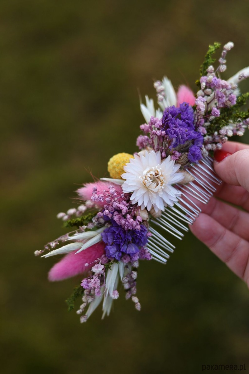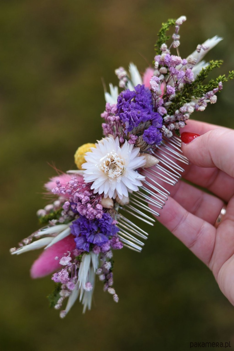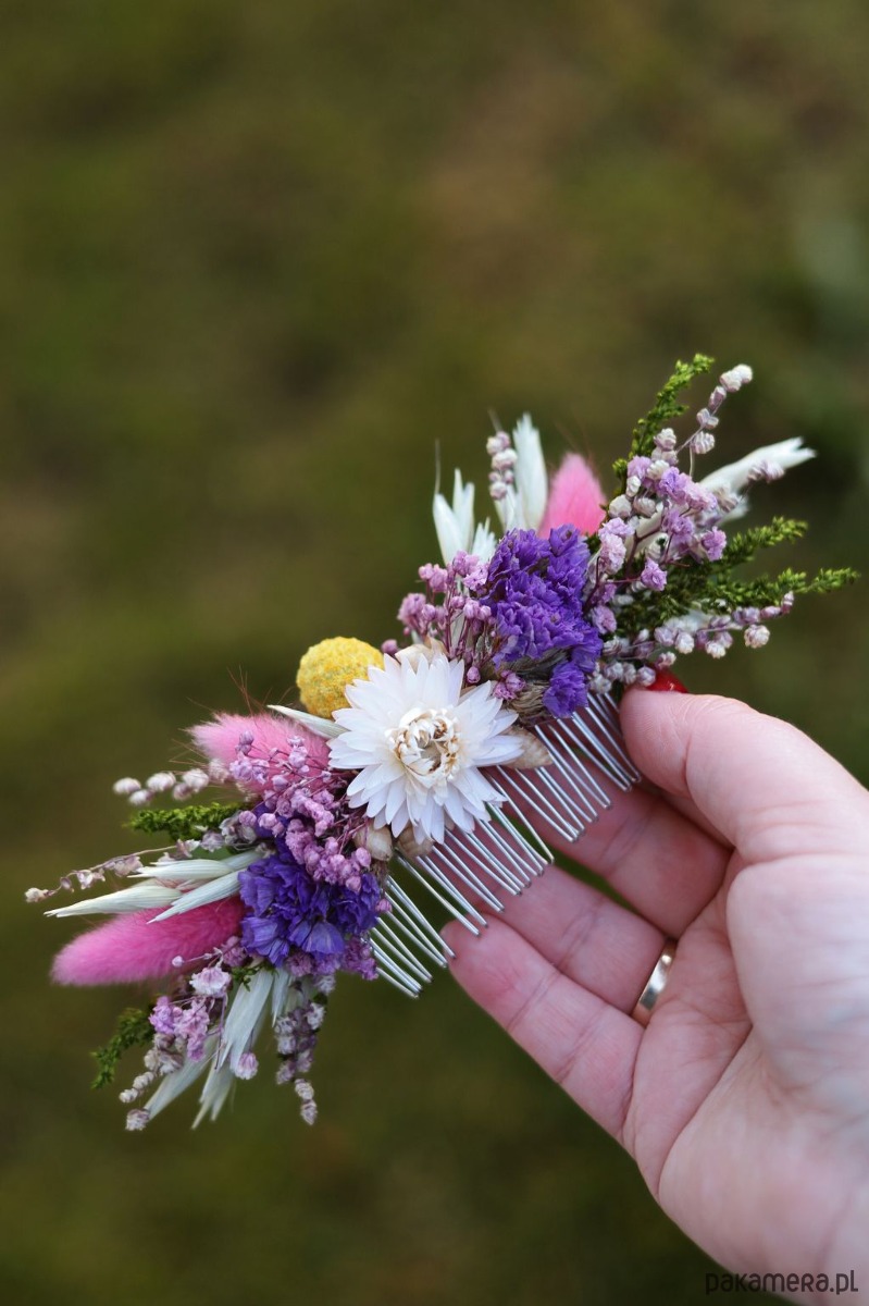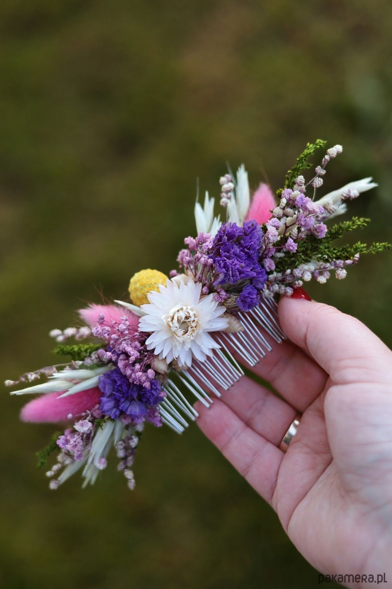 Grzebyk Ślubny to subtelna i naturalna ozdoba, idealna do stylizacji ślubnych w klimacie boho i rustykalnym. Wykonany ręcznie z suszonych i stabilizowanych roślin, takich jak żółta craspedia, fioletowy zatrwian, stabilizowana gipsówka i kwiaty kocanki w centralnej części, zachwyca harmonią i elegancją.