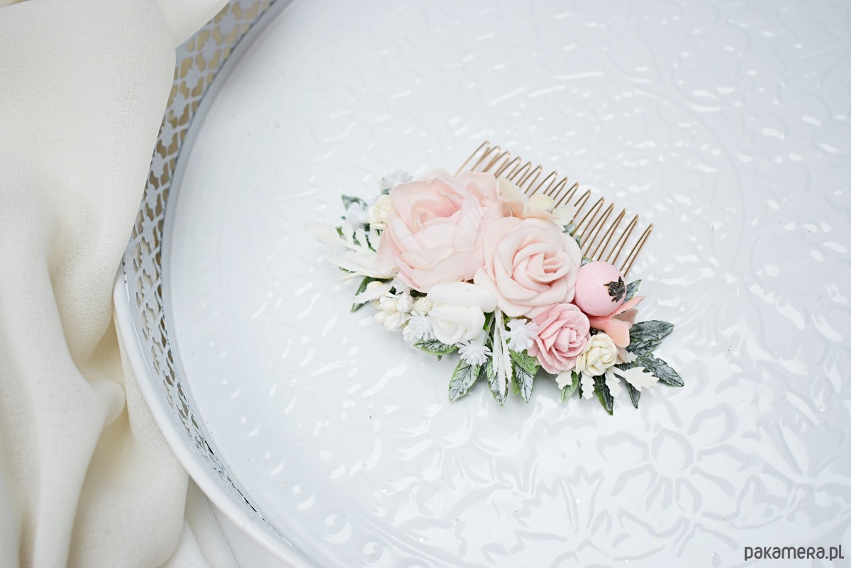 Grzebyk wykonany ze sztucznych kwiatów.