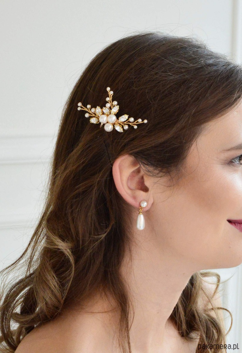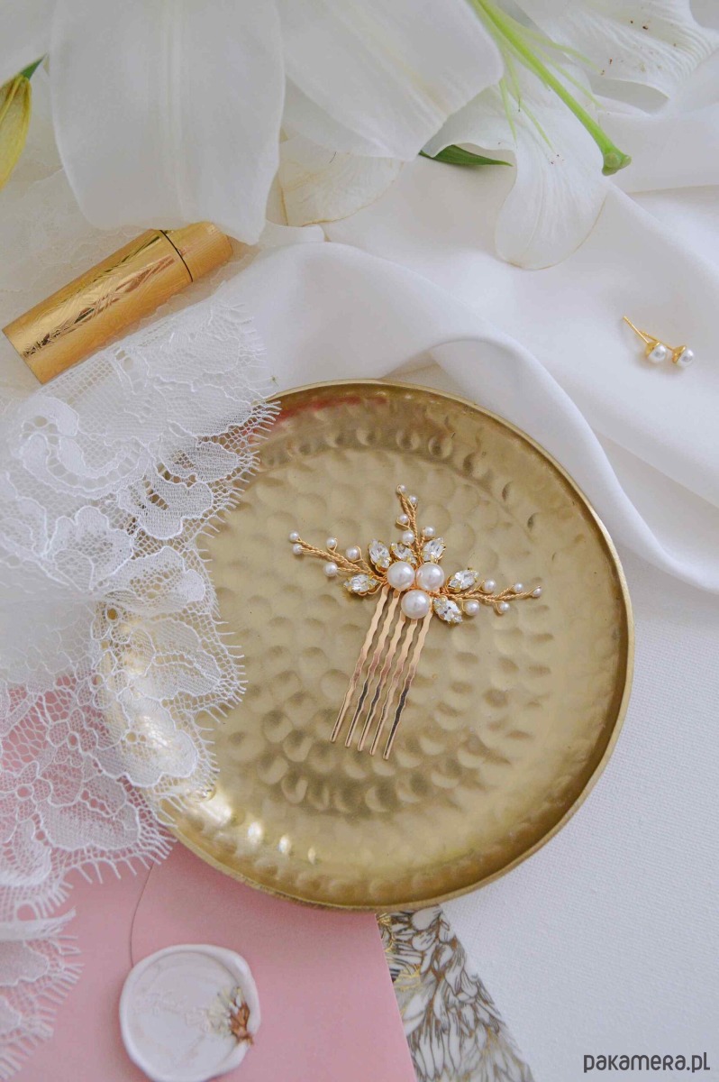 Grzebyk ślubny z gałązkami wykonanymi z pereł Swarovskiego w kolorze białym (odcień ciepły wpadający w ivory). Ozdoba składa się także z pięknie pieniących się cyrkonii Preciosa w złotych oprawach. Perły w rozmiarach od 4 do 10 mm. Mocowaniem jest metalowy grzebyk w kolorze złotym, można go delikatnie wyginać dla lepszego dopasowania do kształtu fryzury.