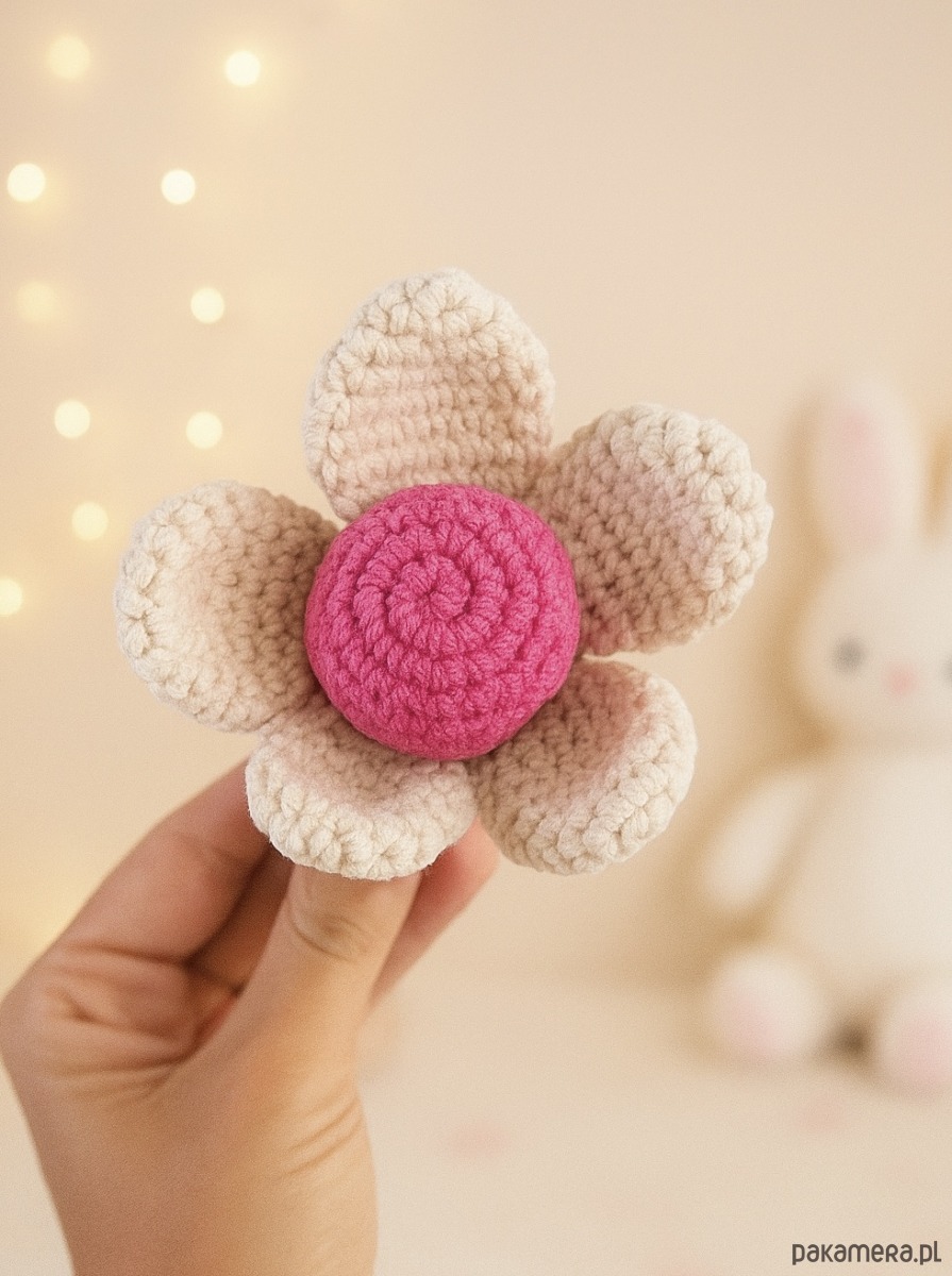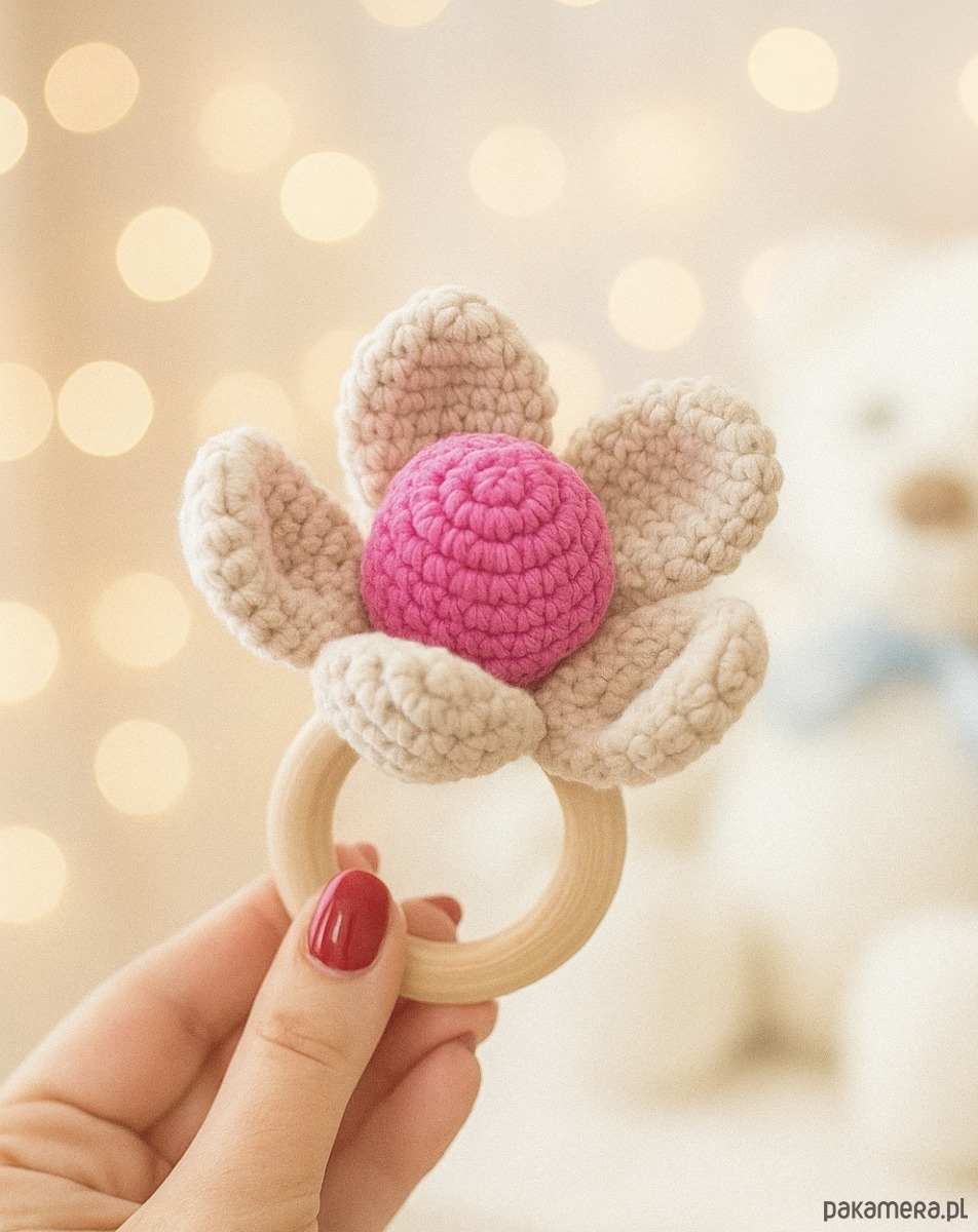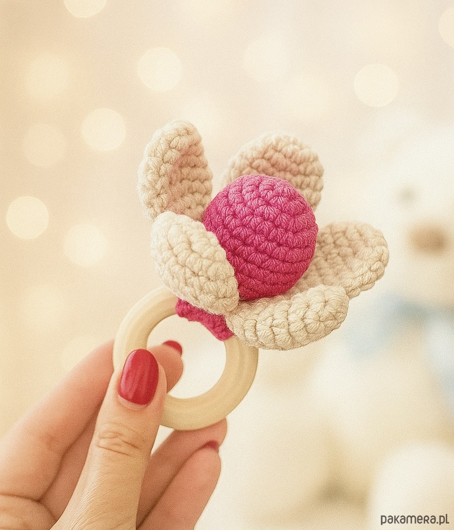 Urocza, ręcznie robiona grzechotka w kształcie kwiatuszka 🌸 wykonana na szydełku.