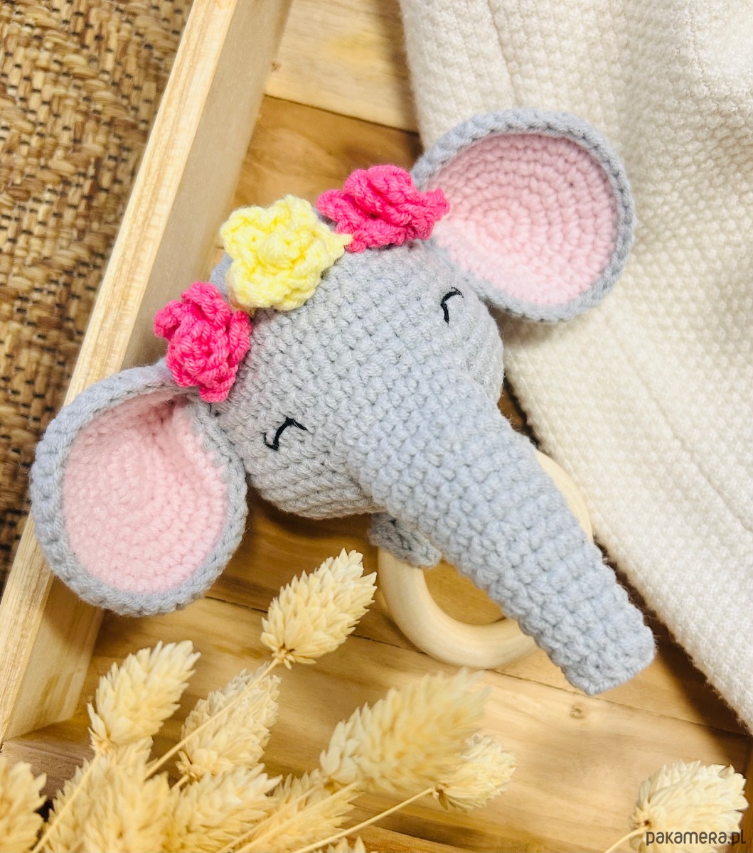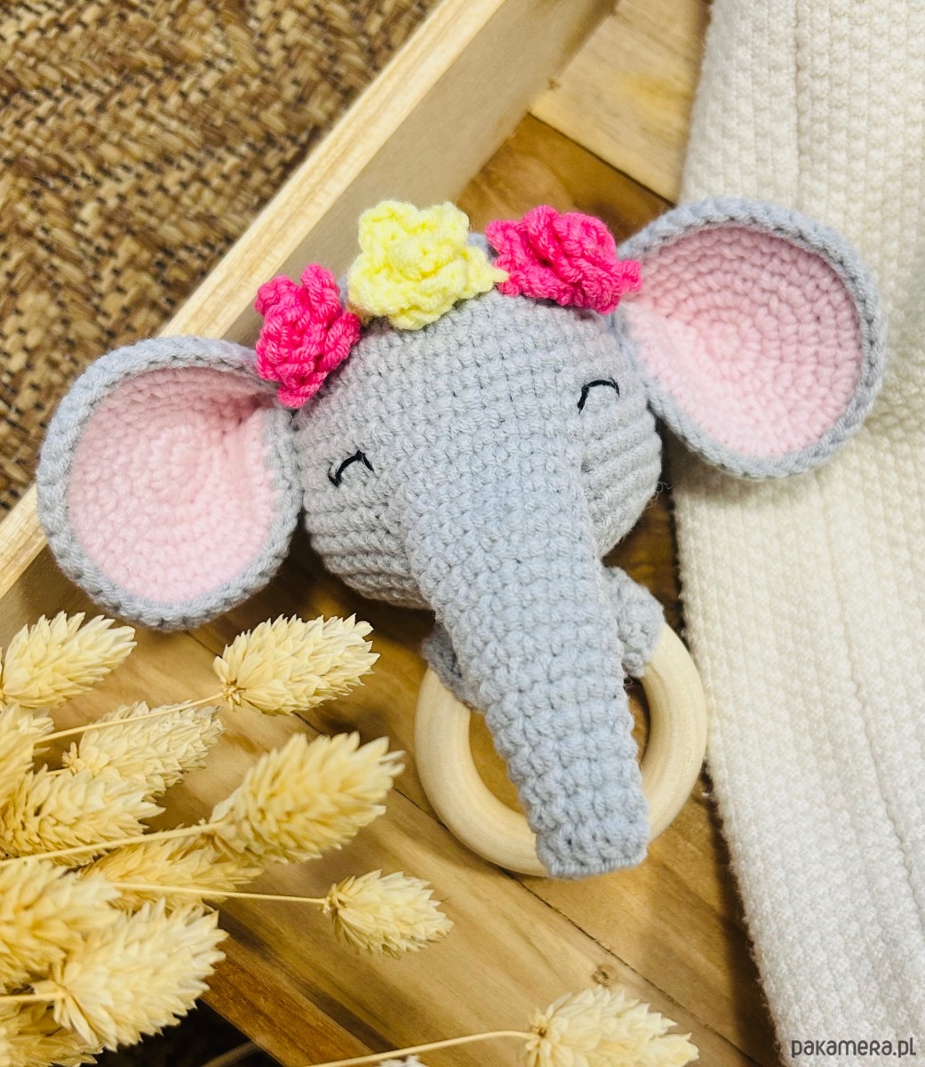 Słonik w kolorze jasnoszarym, jasny róż i opaska z kwiatuszków w ciemniejszym różu i żółtym kolorze.🌸🌸🌸🌸🌸🌸