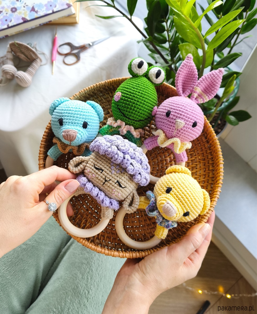- Każda grzechotka dla niemowląt jest bardzo lekka i wygodna dla małych rączek. Wyszydełkowana ręcznie z bezpiecznej miękkiej półbawełnianej włóczki.