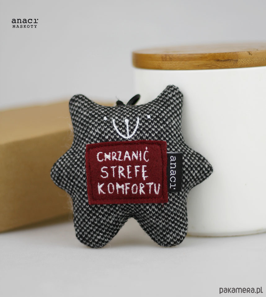 Grzesiek został uszyty z tkaniny tweedowej, zaopatrzony w filcową plakietkę z wyhaftowaną deklaracją, mierzy sobie 10,5 cm.