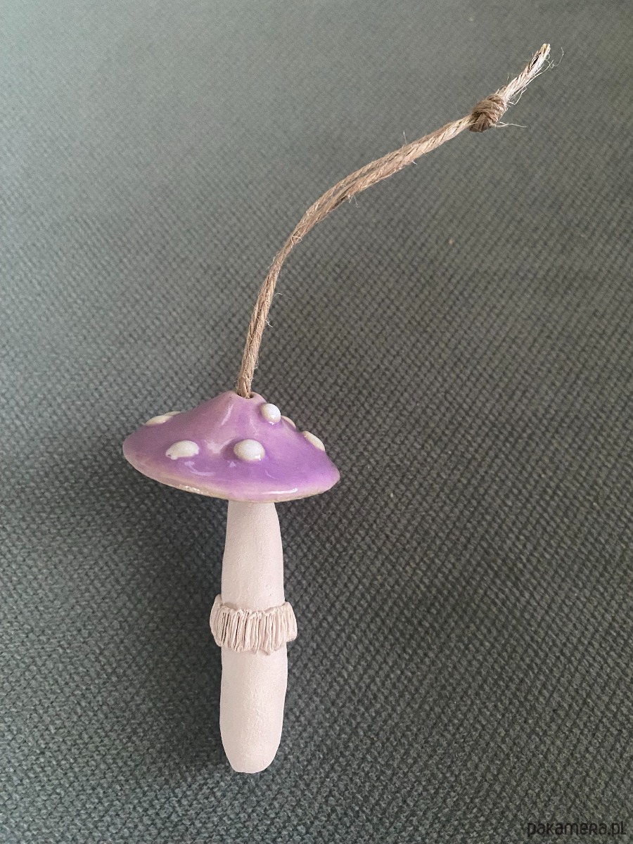 Wykonany ręcznie z gliny, nóżka w kolorze gliny nieszkliwiona, kapelusz szkliwiony lawenda i białe kropki.