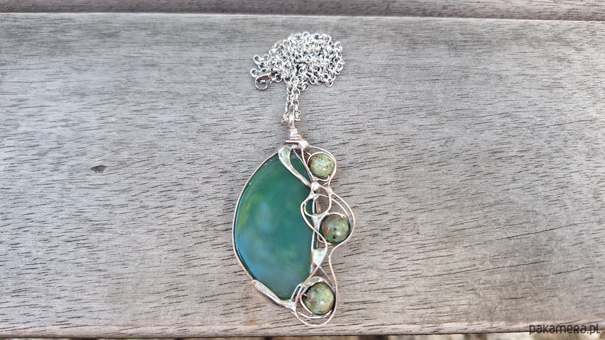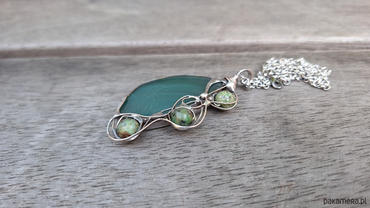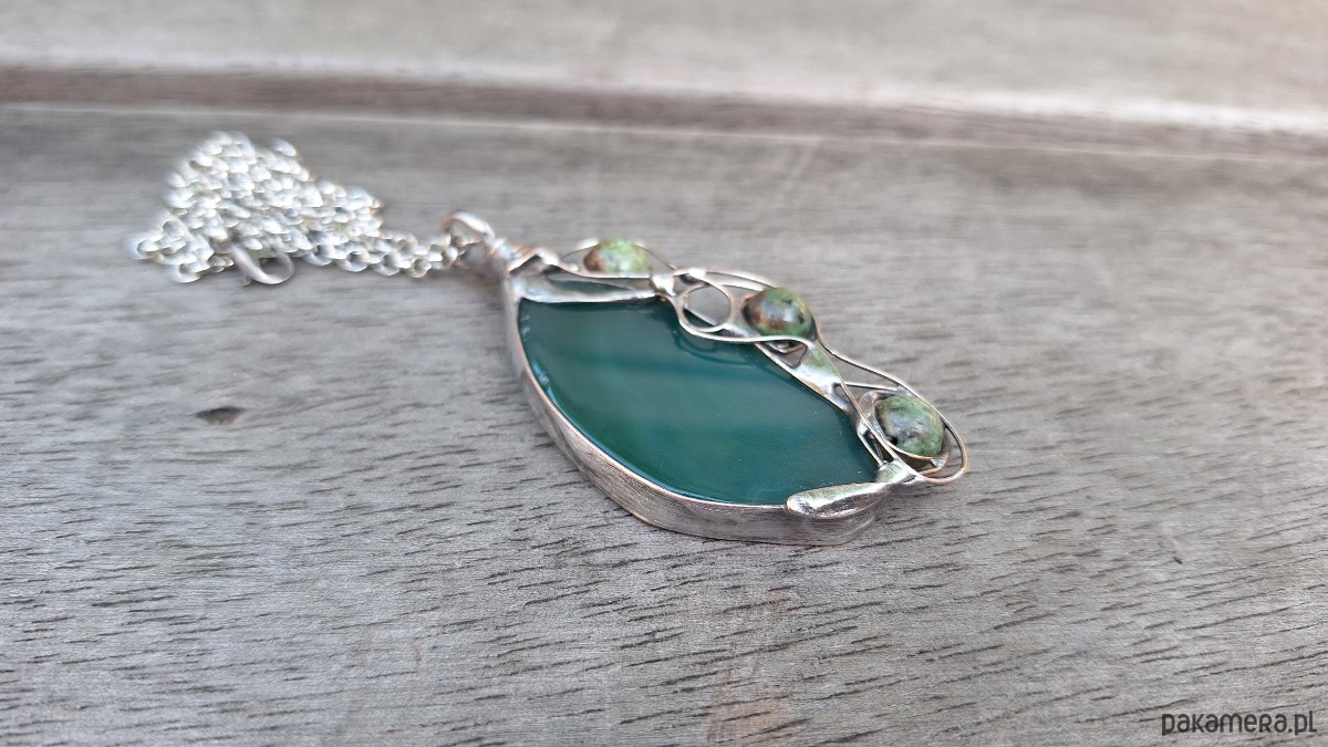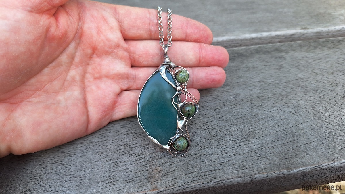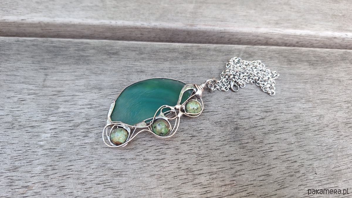 Wisiorek wykonany z miedzi, cyny, turkusów i agatu. Wymiary ok. 6 na 3.5 cm. Zawieszony na łańcuszku o długości ok. 50 cm.