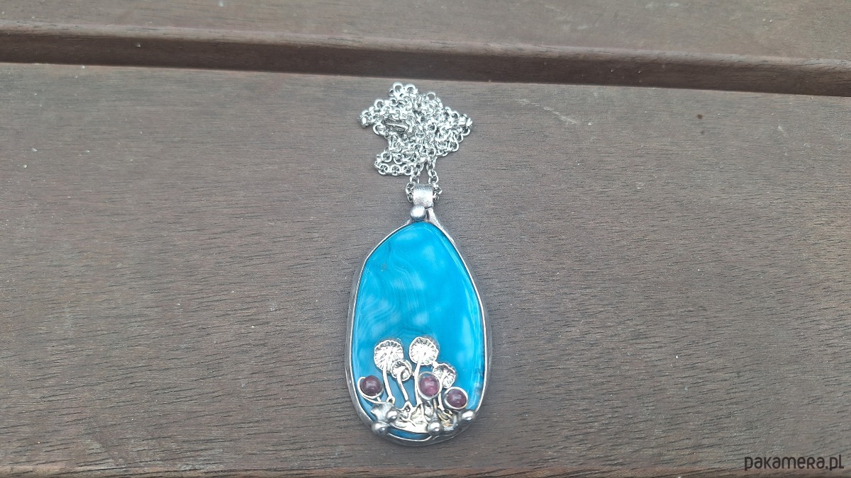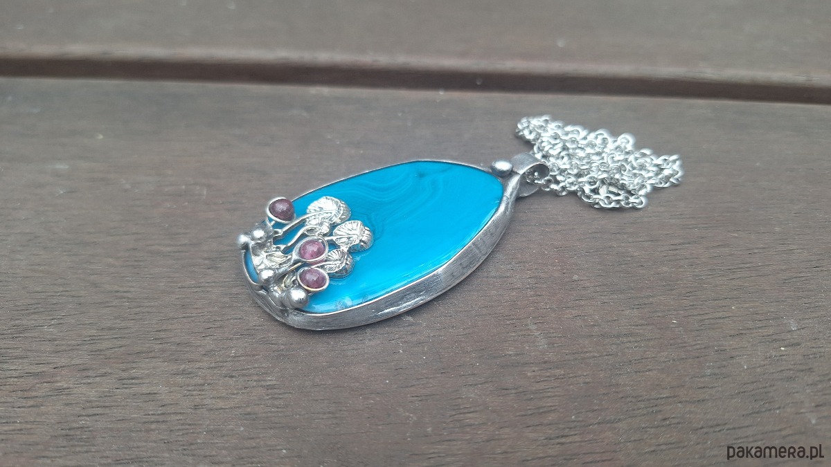 Wisiorek wykonany z miedzi, cyny, granatów i agatu. Wymiary ok. 6 na 3.5 cm. Zawieszony na łańcuszku o długości ok. 50 cm.
