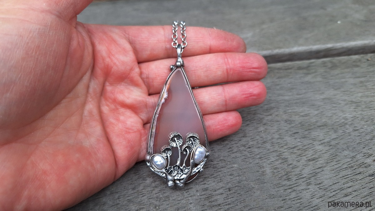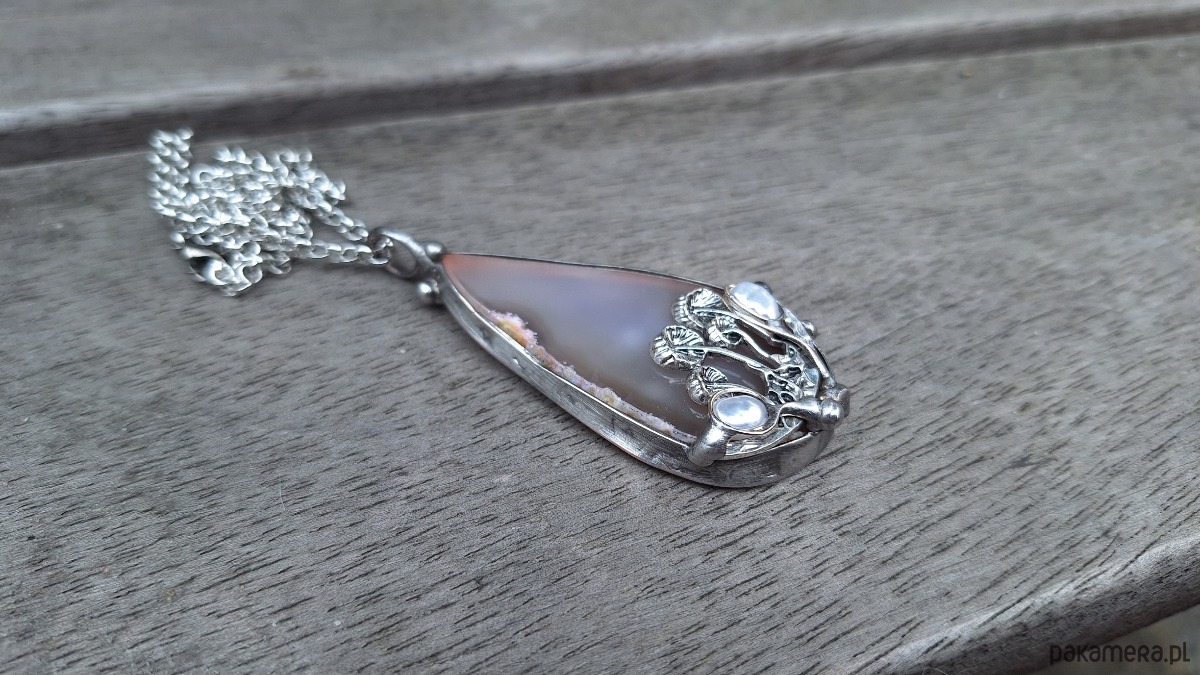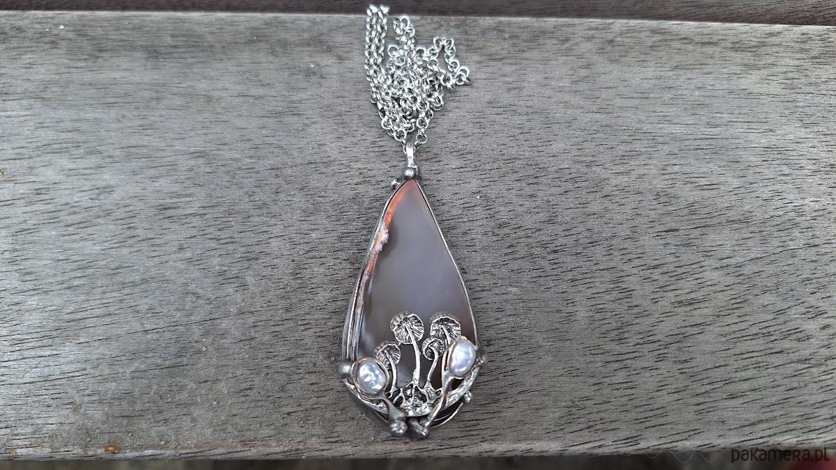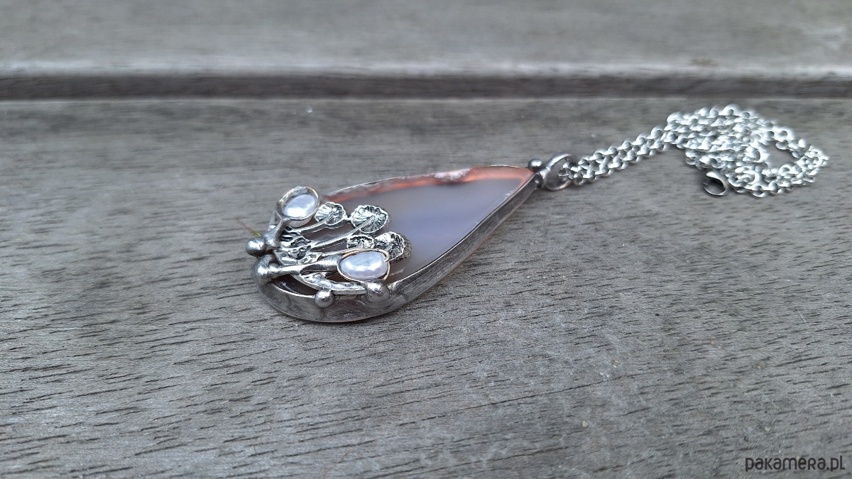 Wisiorek wykonany z miedzi, cyny, pereł i agatu. Wymiary ok. 6 na 3 cm. Zawieszony na łańcuszku o długości ok. 50 cm.