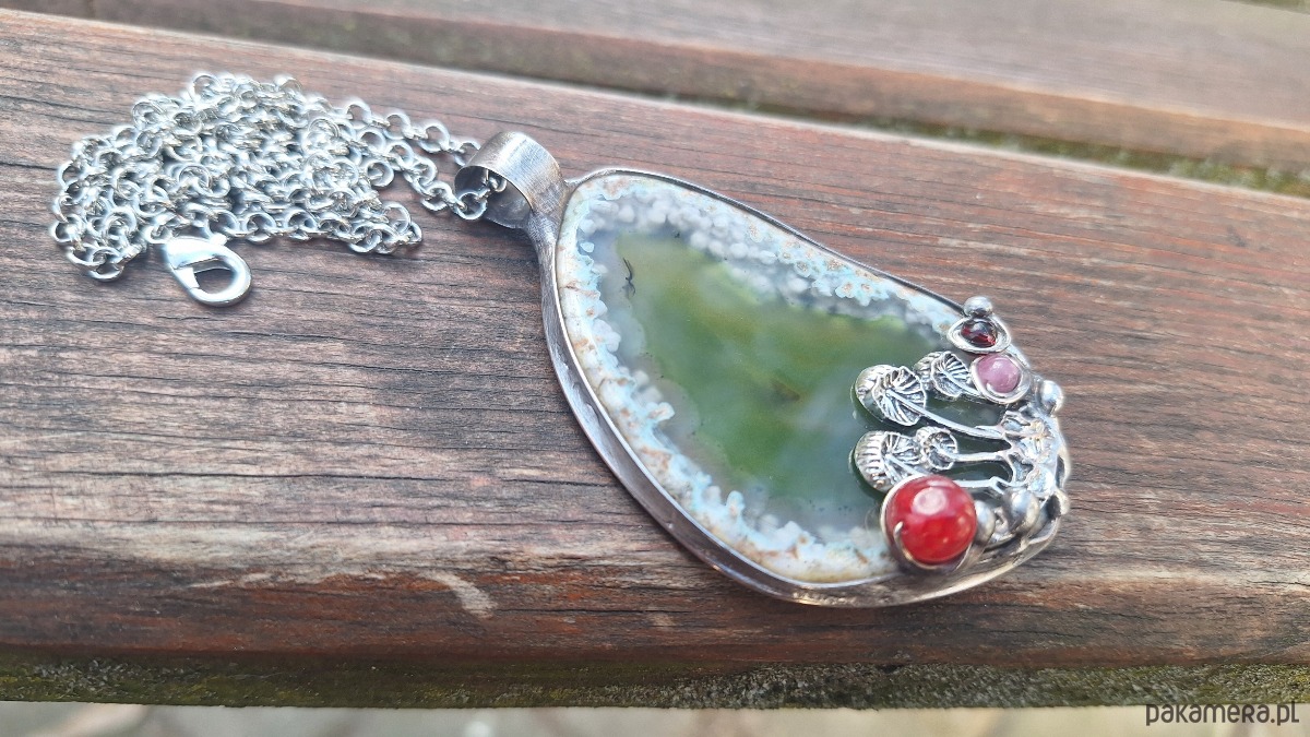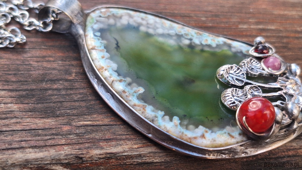 Wisiorek wykonany z miedzi, cyny, turmalinów i agatów. Wymiary ok. 6.5 na 4.5 cm. Zawieszony na łańcuszku o długości ok. 50 cm.