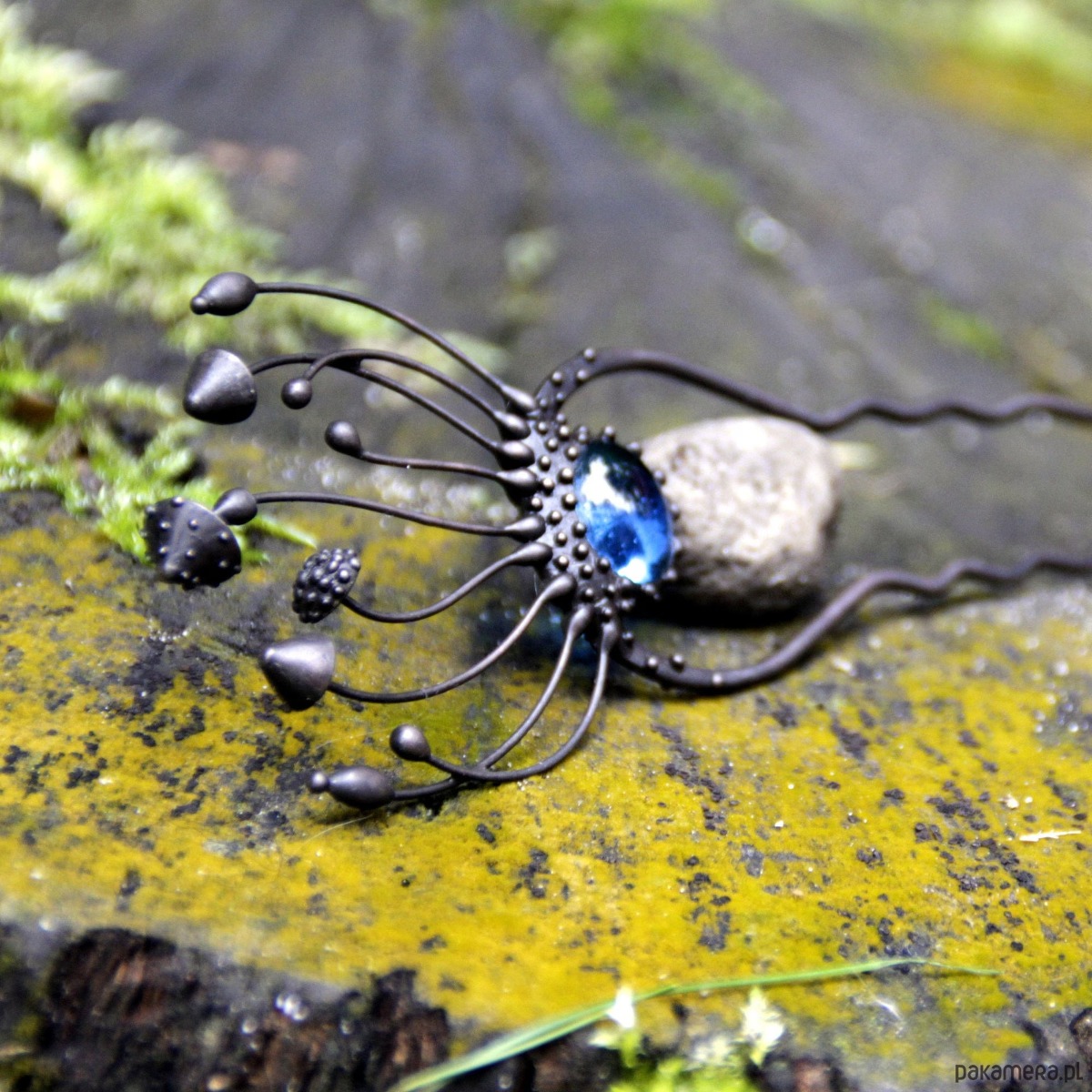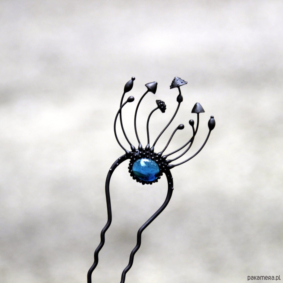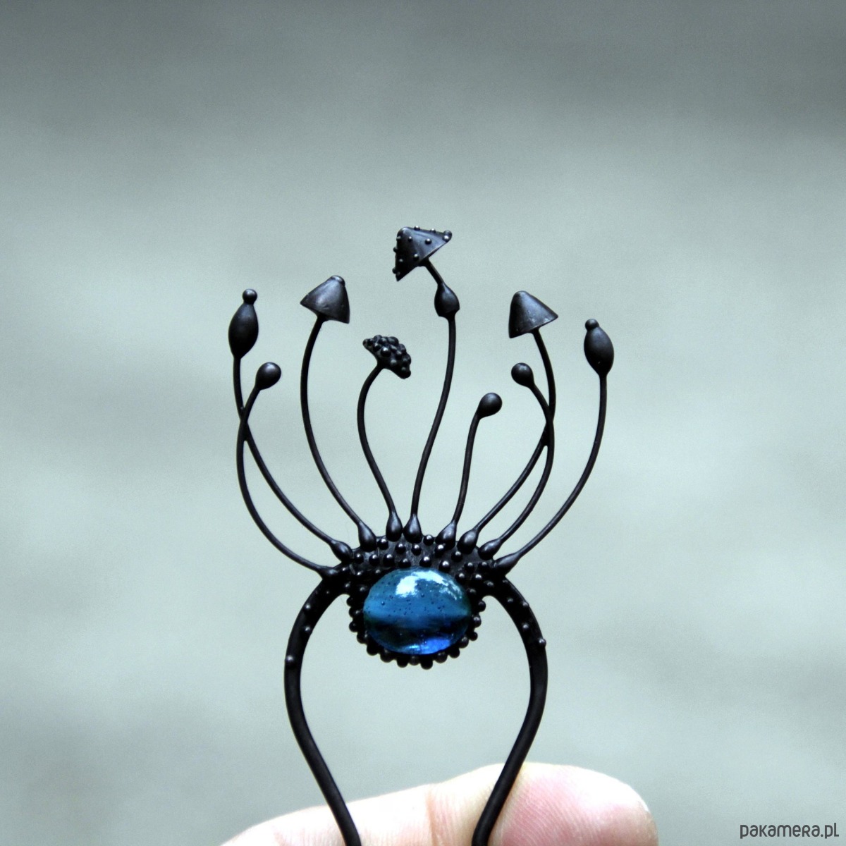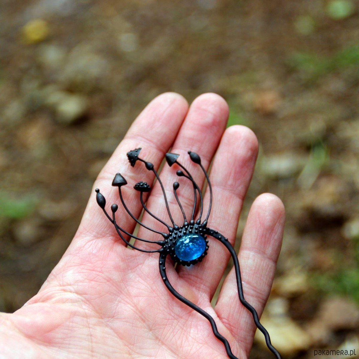 Wróżka w stylu cottagecore, ręcznie robiona metalowa magiczna grzybka muchomor czerwony, spinka do włosów wykonana ręcznie z miedzi, niebieskiego witrażu, cyny, stali. Wszystkie elementy są wykonane ręcznie, co zapewnia indywidualność każdego produktu wytworzonego w warsztacie Yadovito. Stop cyny i miedzi jest polerowany roztworem wykończeniowym, aby nadać biżuterii szlachetny wygląd, a jednocześnie zapobiec utlenianiu się metalu. Każda biżuteria wygląda indywidualnie, ponieważ kapelusze magicznych grzybów są wykonywane ręcznie, a nie odlewane lub tłoczone. Kolor czarny/niebieski. Rozmiar około 14/4,5 cm.