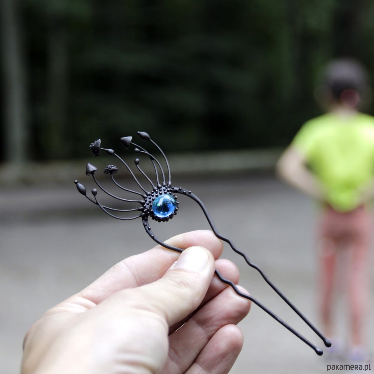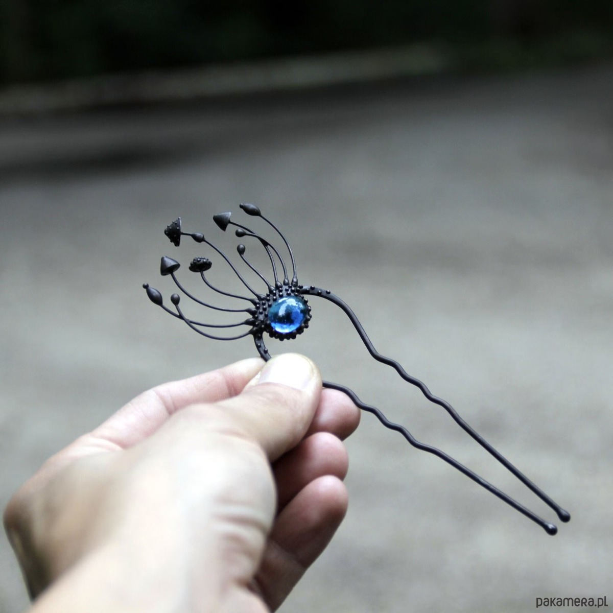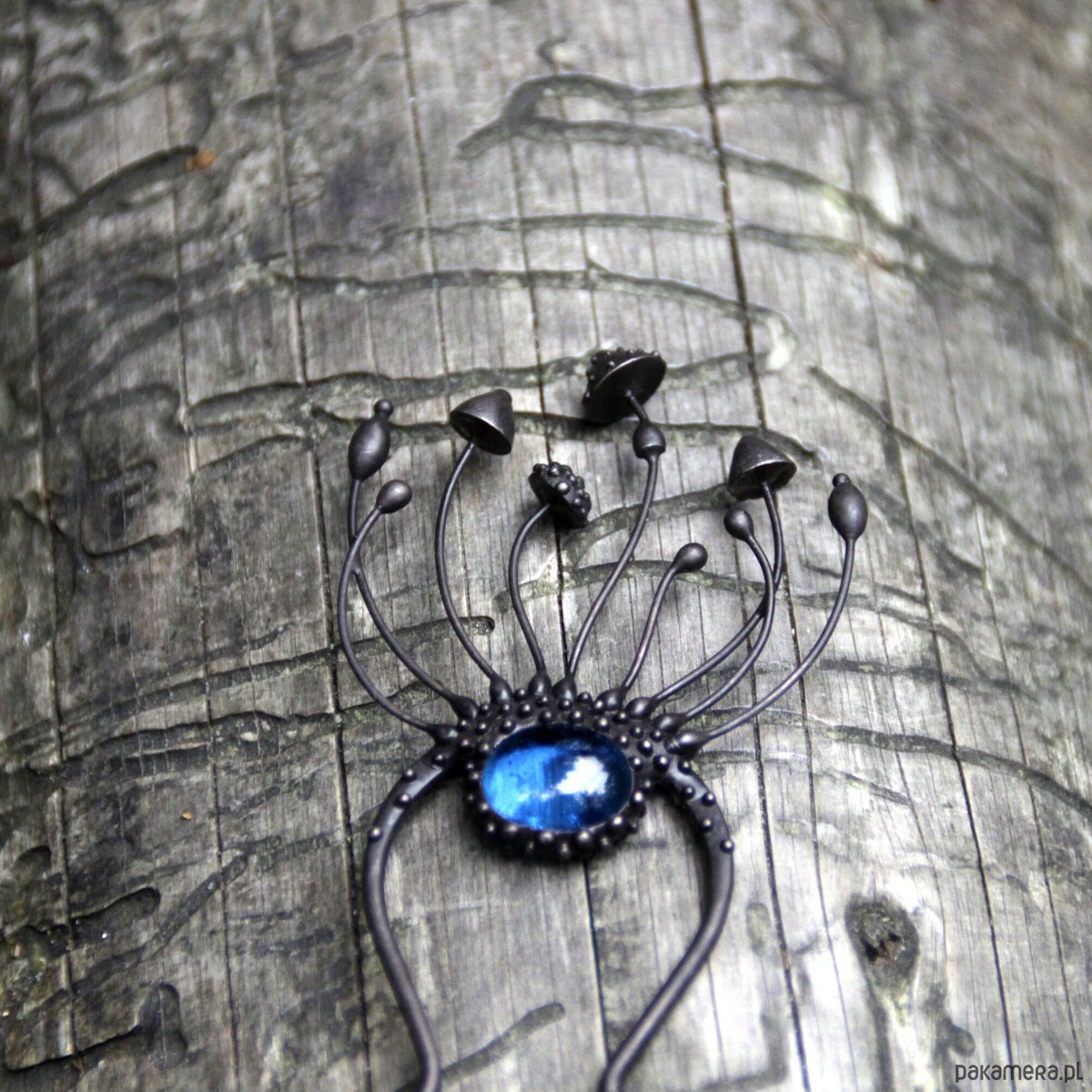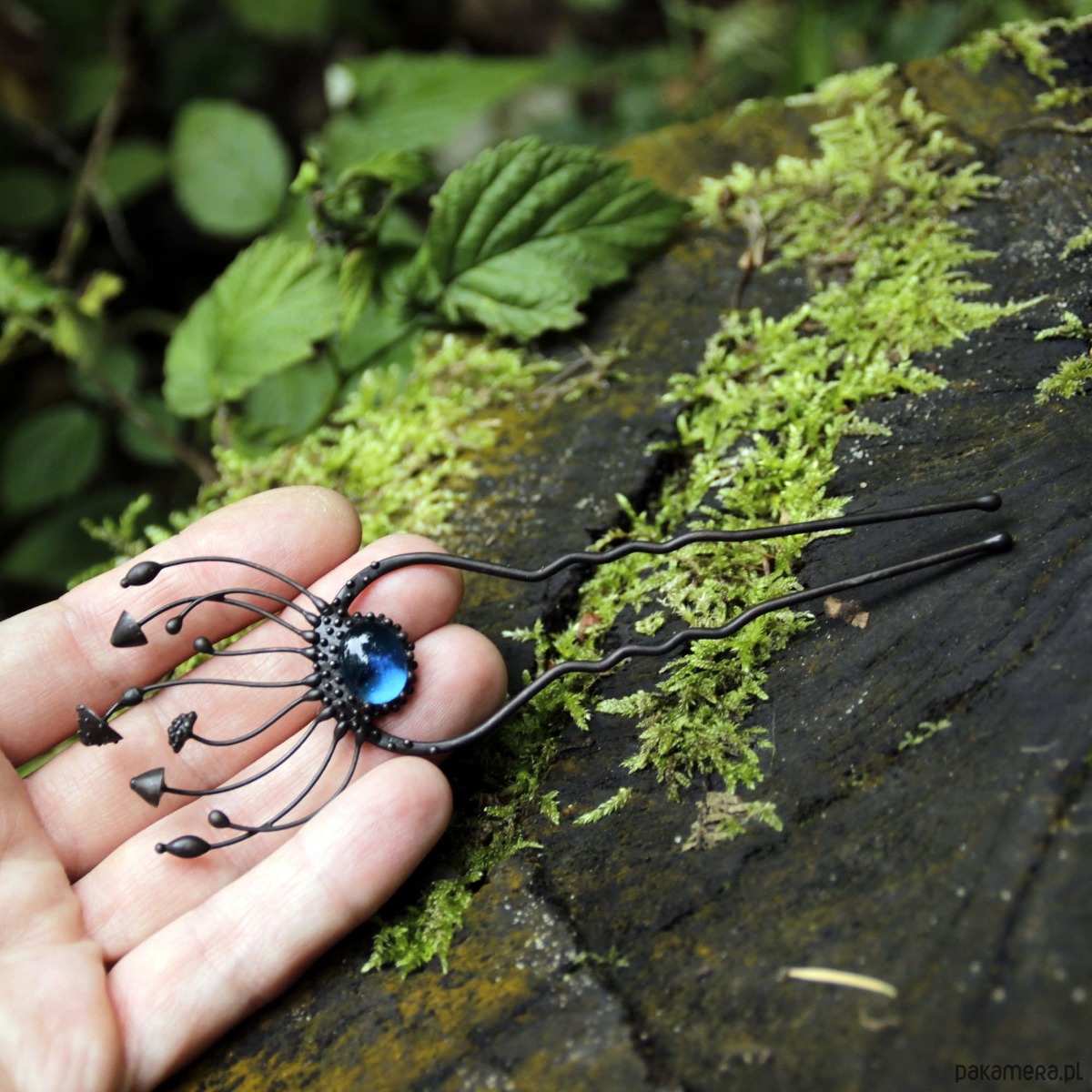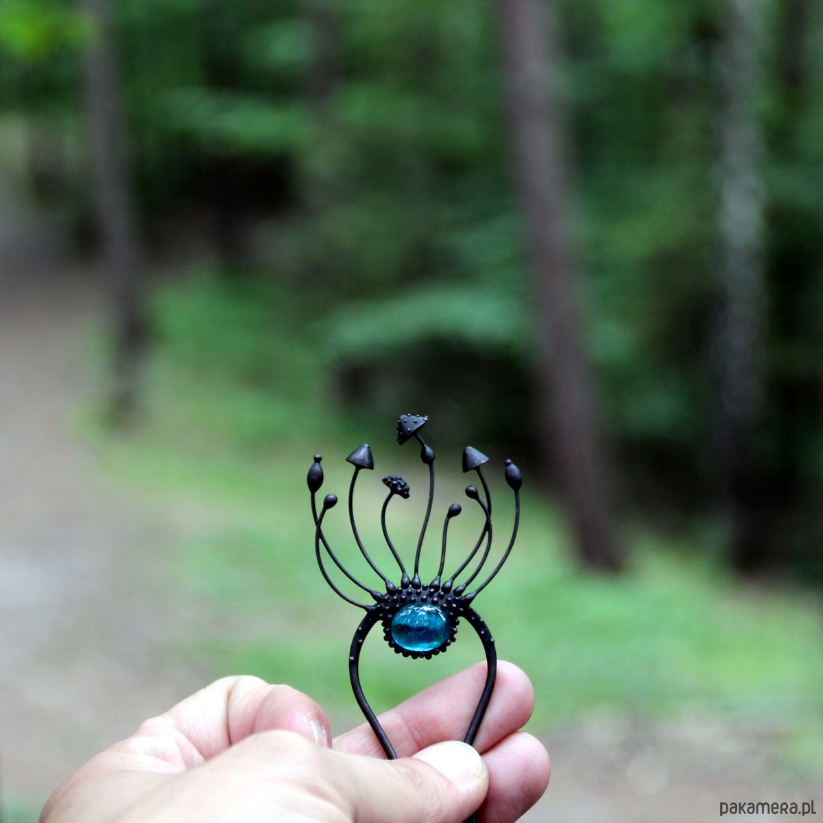 Wróżka w stylu cottagecore, ręcznie robiona metalowa magiczna grzybka muchomor czerwony, spinka do włosów wykonana ręcznie z miedzi, niebieskiego witrażu, cyny, stali. Wszystkie elementy są wykonane ręcznie, co zapewnia indywidualność każdego produktu wytworzonego w warsztacie Yadovito. Stop cyny i miedzi jest polerowany roztworem wykończeniowym, aby nadać biżuterii szlachetny wygląd, a jednocześnie zapobiec utlenianiu się metalu. Każda biżuteria wygląda indywidualnie, ponieważ kapelusze magicznych grzybów są wykonywane ręcznie, a nie odlewane lub tłoczone. Kolor czarny/niebieski. Rozmiar około 14/4,5 cm.