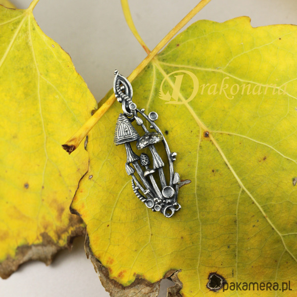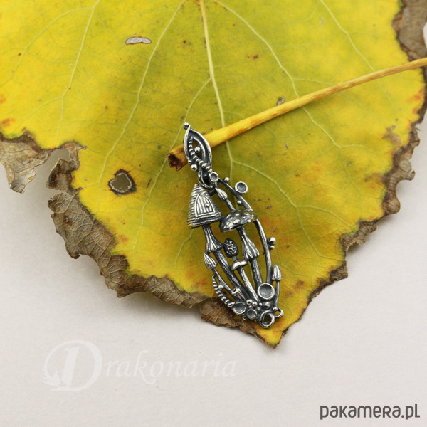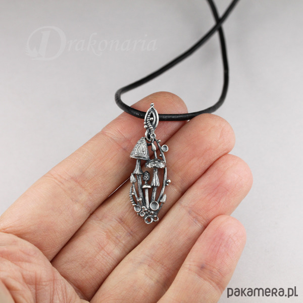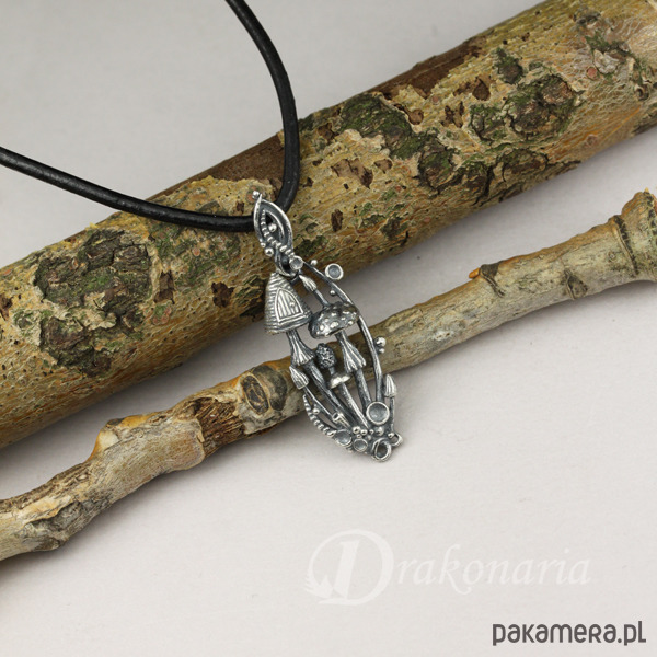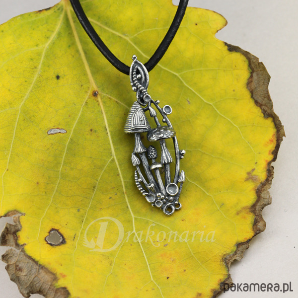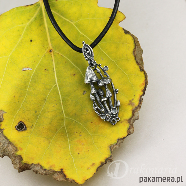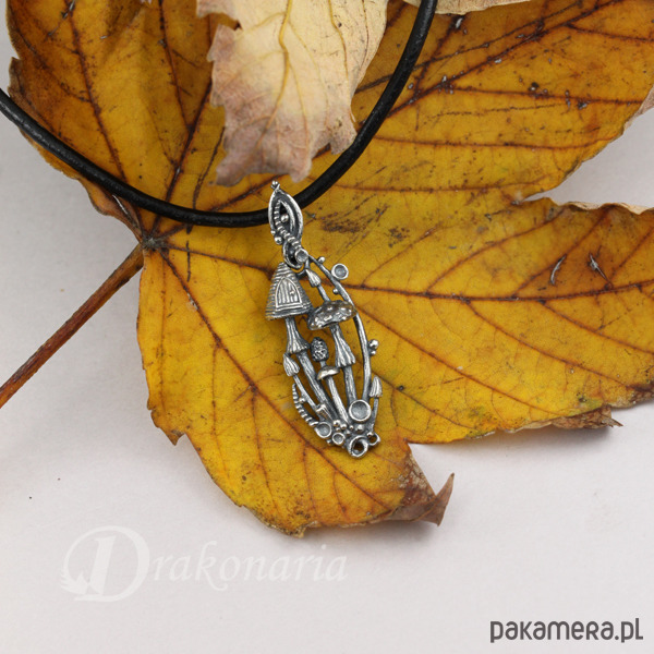 Pełen niesamowitych detali, ażurowy wisiorek, zdobiony miniaturowymi grzybkami, porostami i maleńkimi, zagadkowymi drzwiami. Całość wykonana ze srebra pr. 925, zaprojektowana całkowicie ręcznie przeze mnie. Praca oksydowana i polerowana.