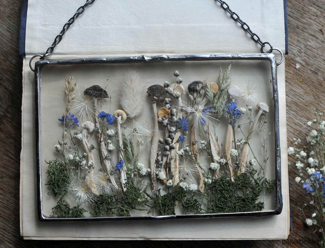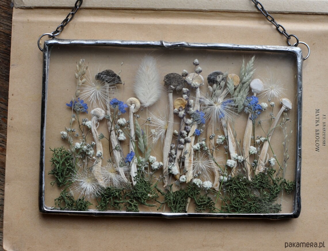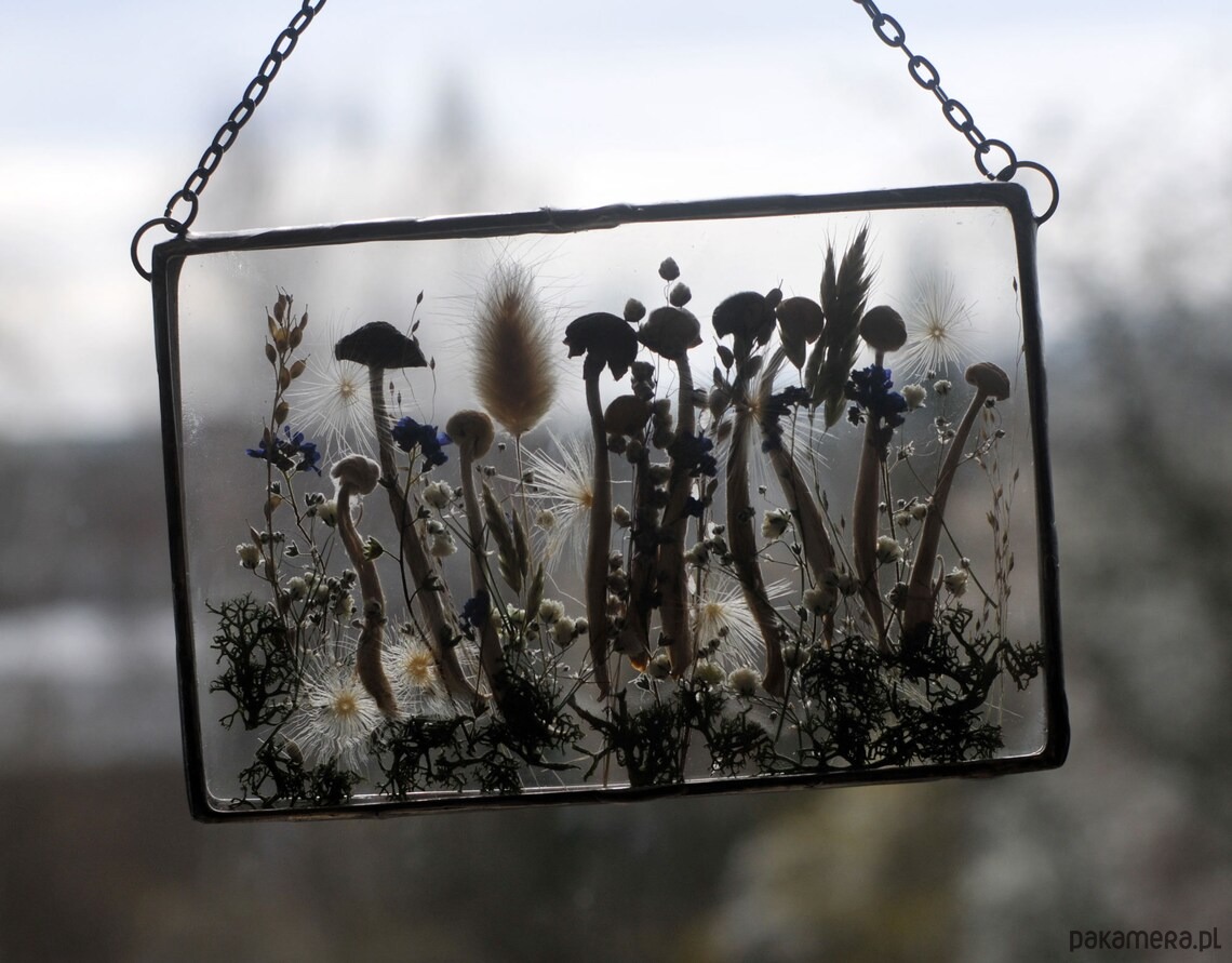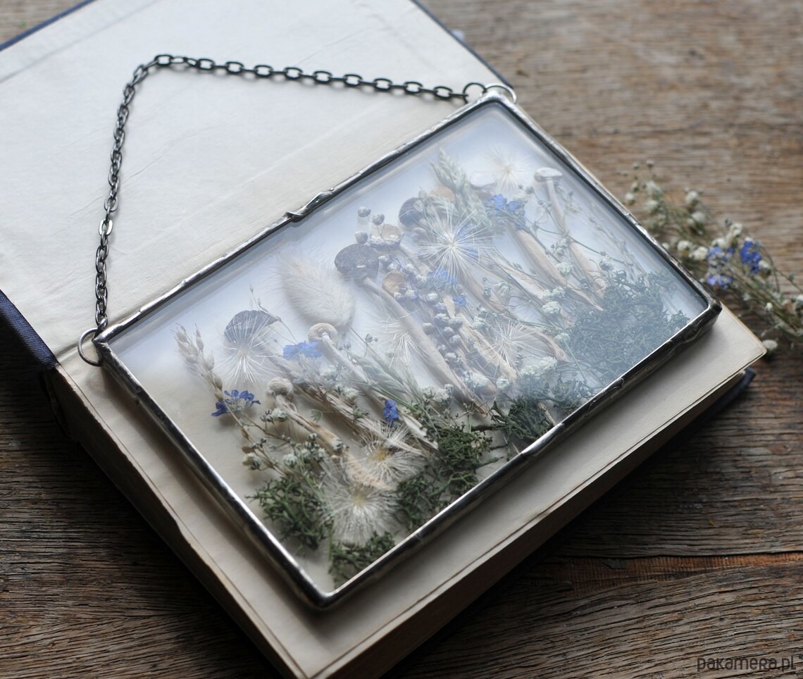 W szkle umieszczone są prawdziwe, suszone rośliny.