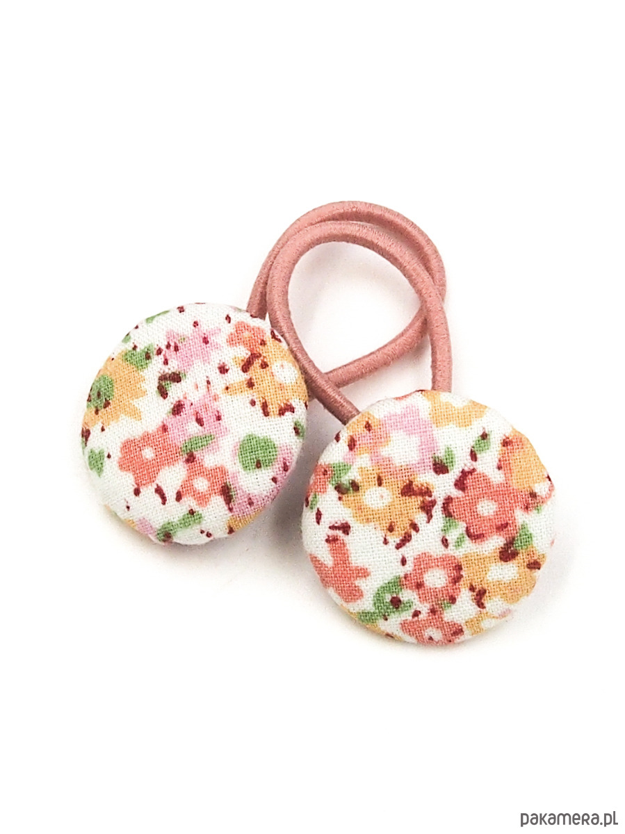 Wykonane z ręcznie robionych guzików z tkaniny bawełnianej w drobne kolorowe kwiatki.