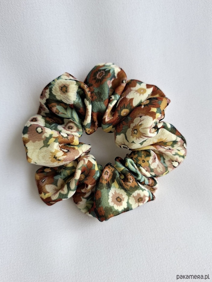 Scrunchie Fiona to to niezwykle efektowna gumka do włosów dzięki jej wyjątkowej kombinacji kolorystycznej i princie w kwiatuszki. Subtelna i bardzo dziewczęca. Puchata i leciutka jak chmurka.