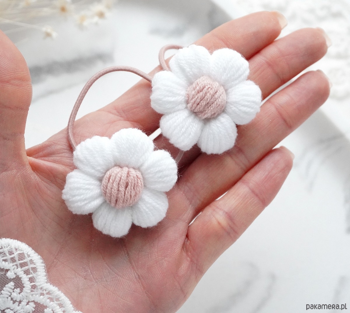 Kwiatki wykonane na szydełku zdobione perełką.
