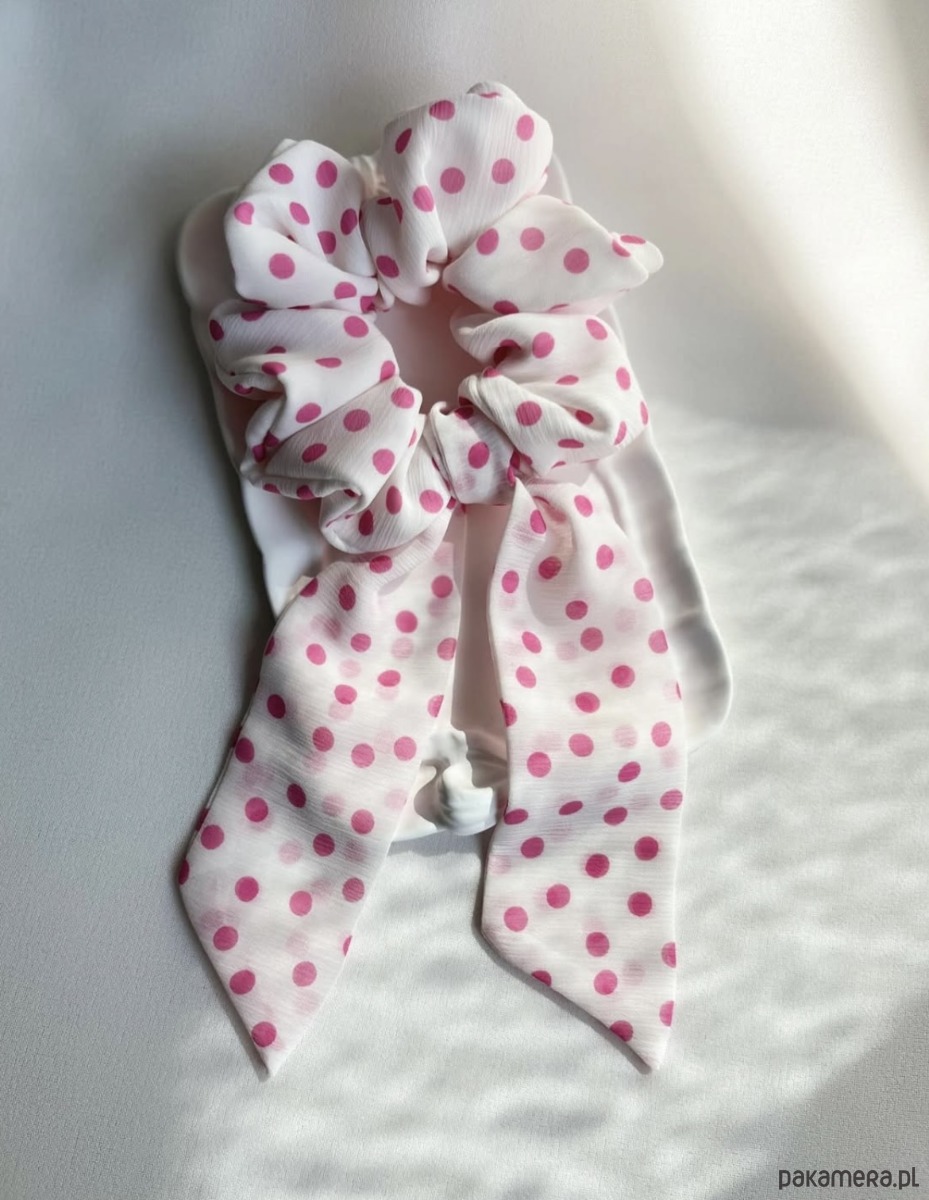 Scrunchie Dottie to to niezwykle efektowna gumka do włosów w różowe kropeczki. Subtelna i bardzo dziewczęca. Puchata i leciutka jak chmurka.