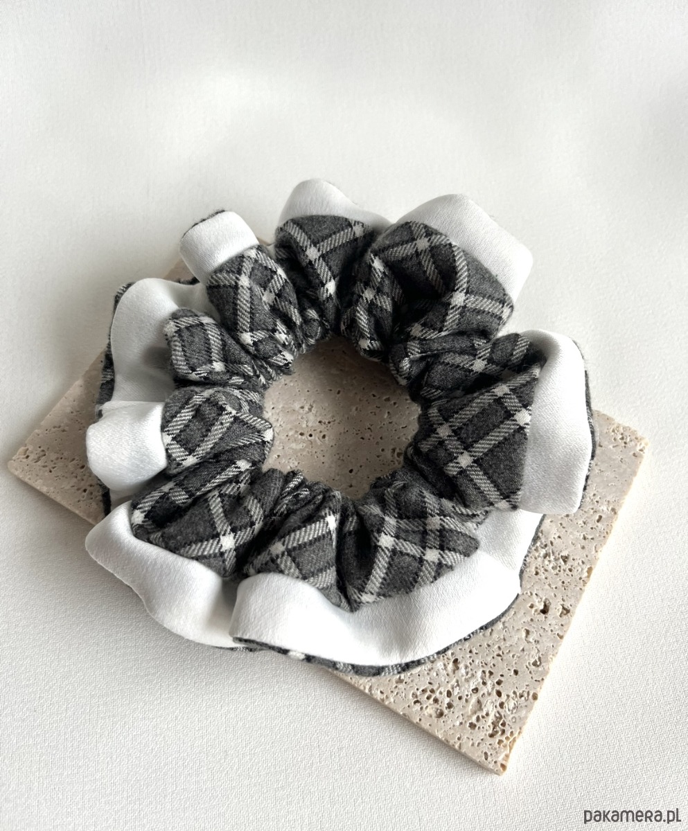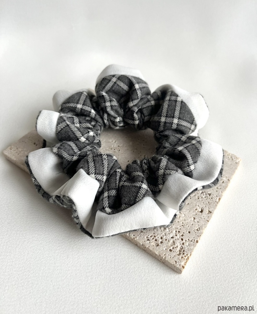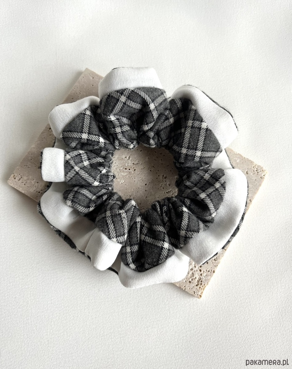 Klasyczna kratka nadaje jej ponadczasowego charakteru z nutą retro. Geometryczny wzór jest subtelny, a jednocześnie wyrazisty. Pięknie komponuje się zarówno z jasnymi, jak i ciemnymi włosami. Całość dopełnia kontrastowa, jasna lamówka, która delikatnie podkreśla kształt scrunchie i dodaje jej lekkości oraz eleganckiego wykończenia.