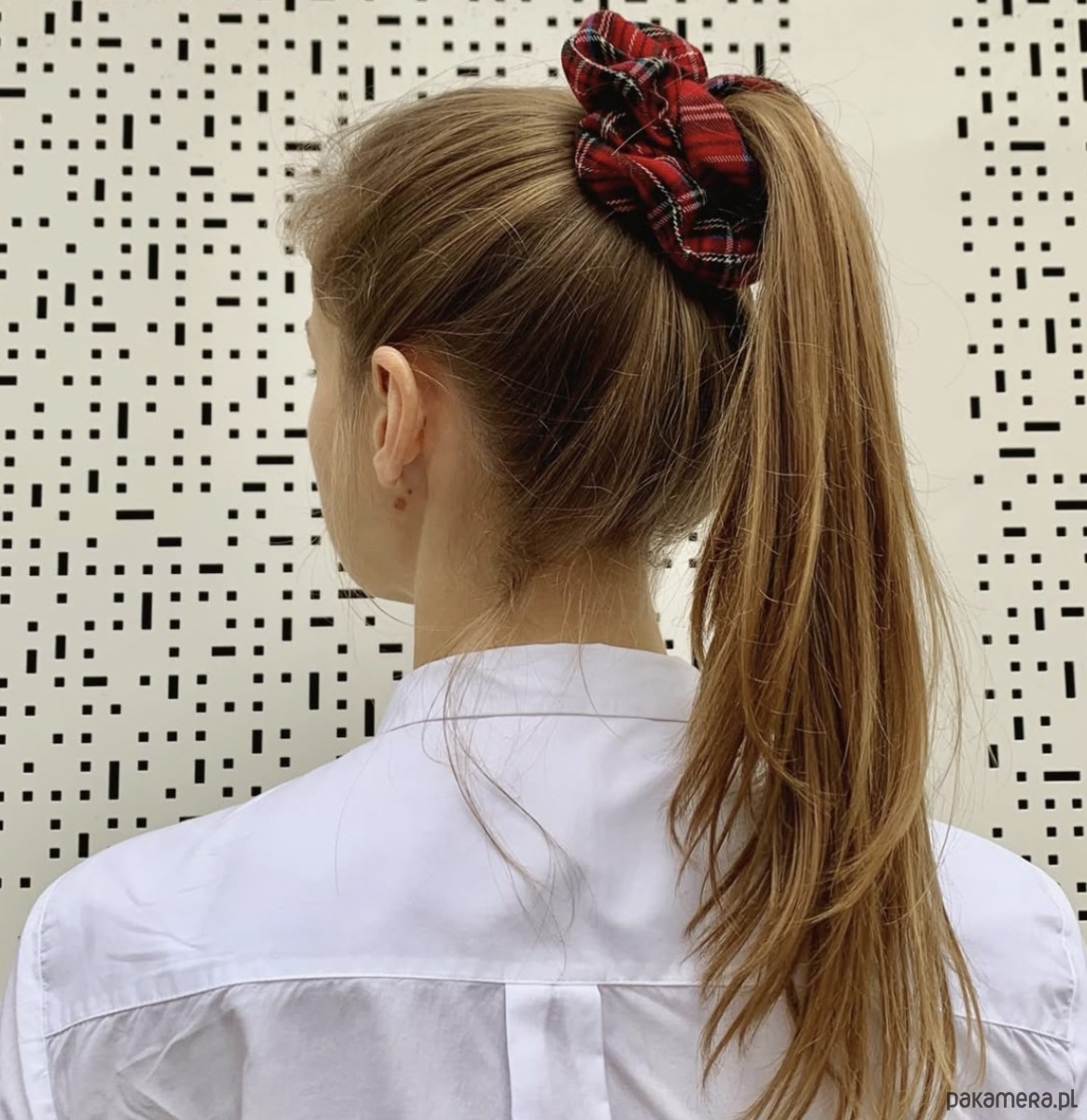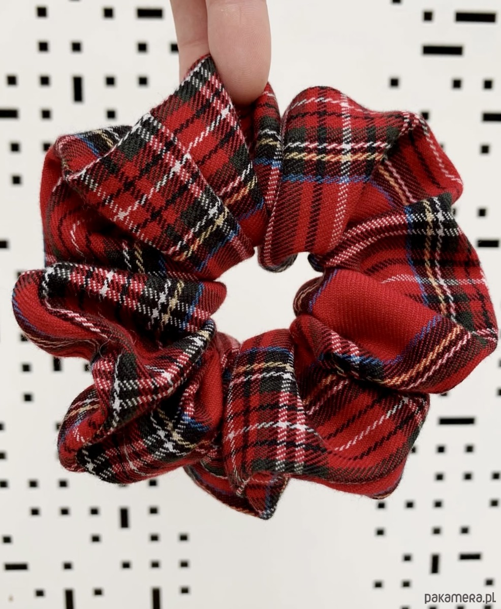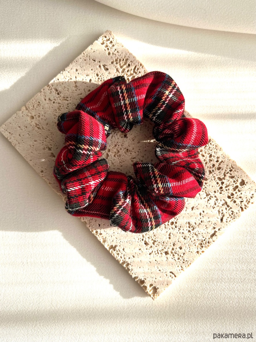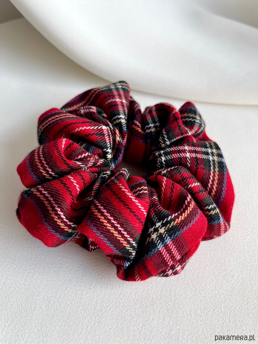 Scrunchie Red Check Chic w czerwoną kratkę z niebieskimi akcentami to minimalistyczny, a zarazem efektowny dodatek do jesiennej czy też zimowej stylizacji. Wykonana z miękkiej tkaniny, pięknie układa się na włosach.