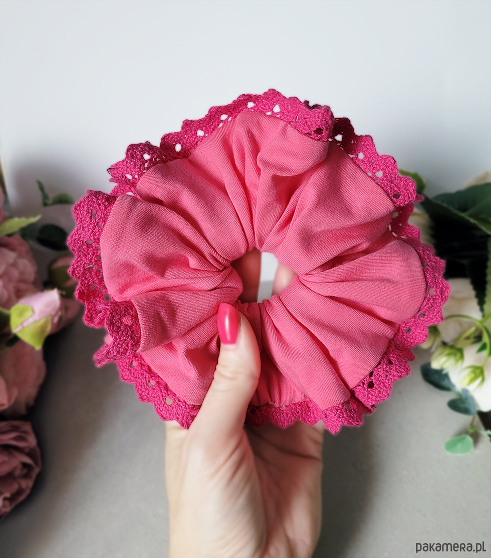 Przepiękna gumka do włosów Maxi Scrunchie Cukierkowy róż z koronką.
