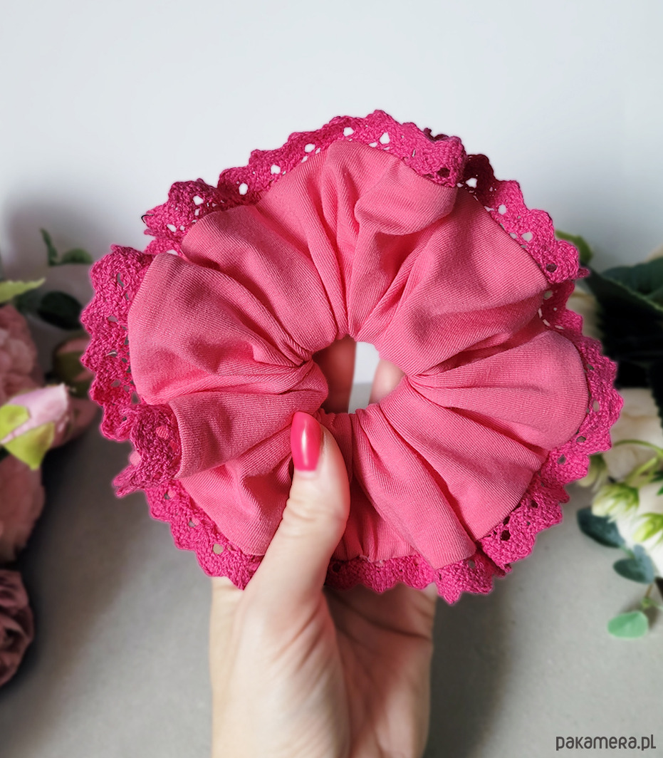 Przepiękna gumka do włosów Maxi Scrunchie Cukierkowy róż z koronką.