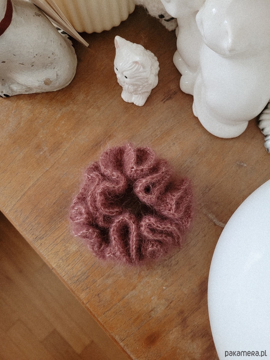 Gumka scrunchie w kolorze antycznego różu. Zrobiona ręcznie na szydełku z miękkiej i lekkiej wełny moherowej z dodatkiem jedwabiu morwowego. Wygląda pięknie na włosach lub jako ozdoba na nadgarstku.