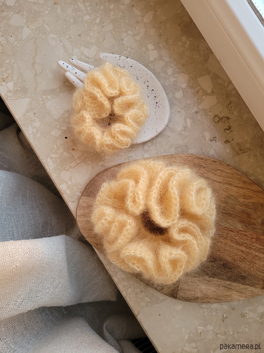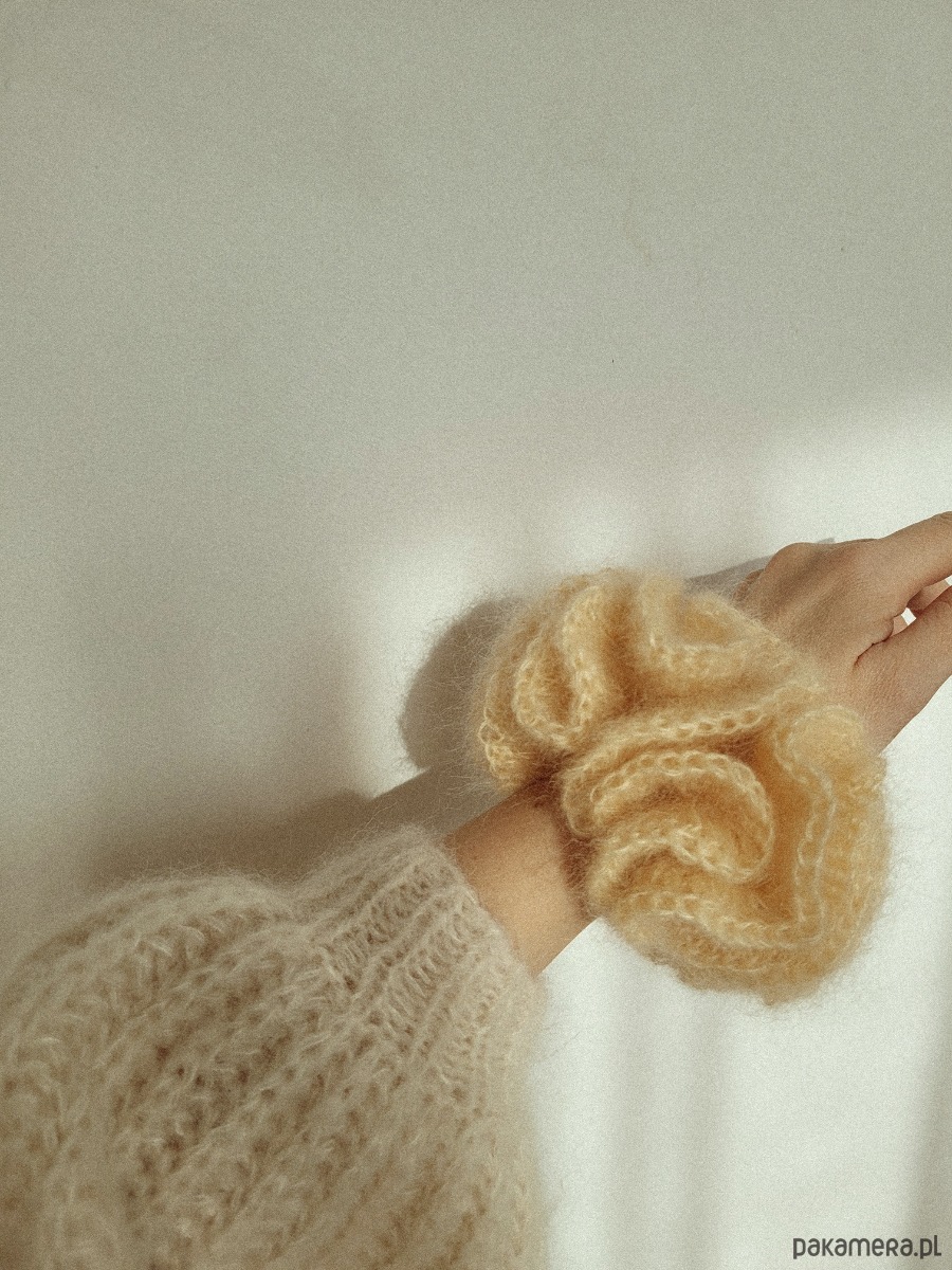 Gumka scrunchie w kolorze masełka. Zrobiona ręcznie na szydełku z miękkiej i lekkiej wełny moherowej z dodatkiem jedwabiu morwowego. Wygląda pięknie na włosach albo jako ozdoba na nadgarstku.