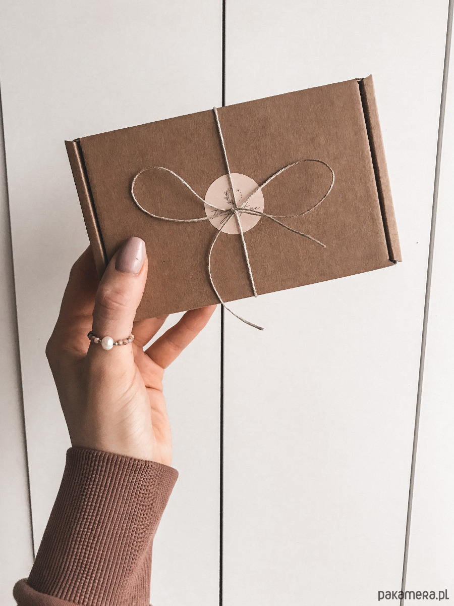 Scrunchie pakowane są w bibułę i kartonik przewiązany ozdobnym sznureczkiem.