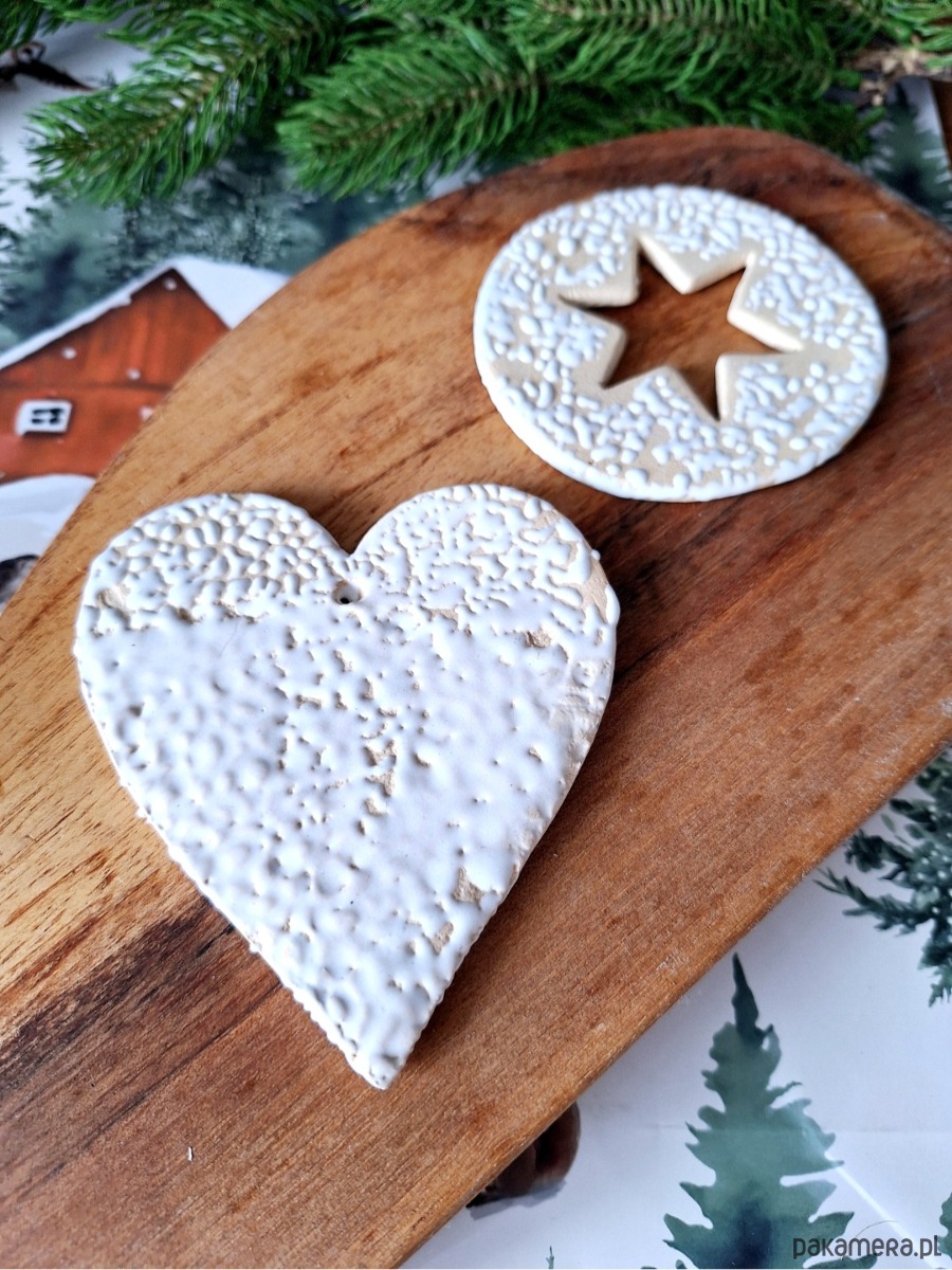 Ceramiczne serce oraz gwiazdka w okrągłej zawieszce. Zawieszki z jasnej gliny szkliwiona na biało specjalną techniką ceramiczną dającą charakterystyczną wypukłą strukturę na biskwicie. Ozdoby ręcznie formowane i szkliwione. Do zestawu dołączona jest złota nitka do zawieszania. Znakomicie wyglądają na choince.