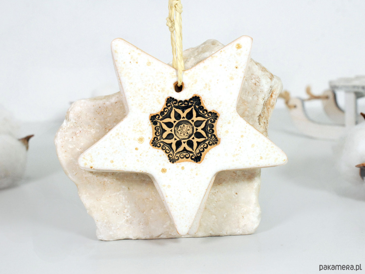 Ręcznie wykonane ceramiczne gwiazdki z brązową mandalą to elegancka i subtelna ozdoba, która pięknie ozdobi każdą choinkę. Ozdobny ornament dodaje im charakteru i sprawia, że świetnie sprawdzą się zarówno w tradycyjnych, jak i nowoczesnych wnętrzach. Idealne jako dekoracja świąteczna, zawieszka do okna czy drobny prezent dla najbliższych