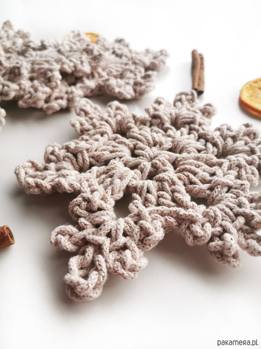 Piękne dekoracyjne gwiazdki - śnieżynki w kolorze beżowym ze złotą nitką. Niesamowicie pobłyskują w świetle lamp lub świec.