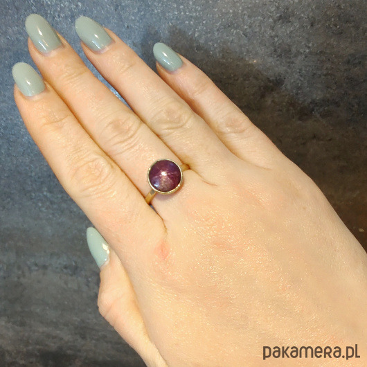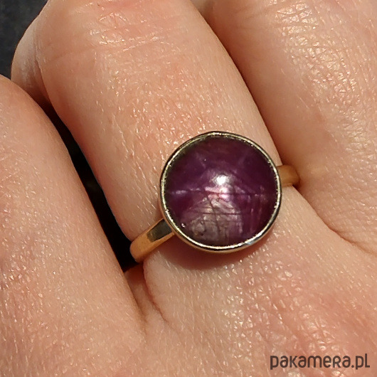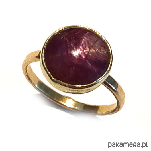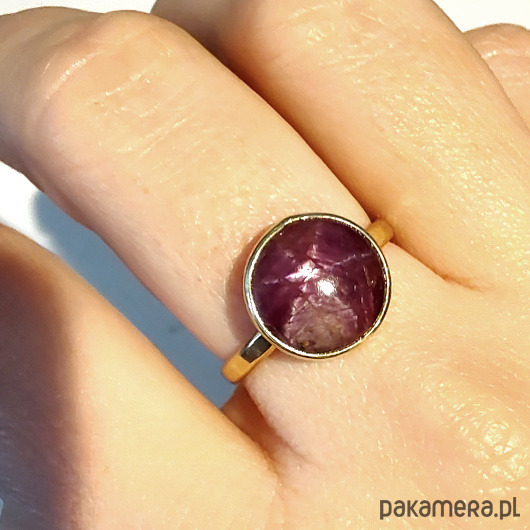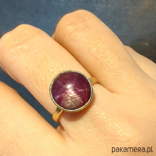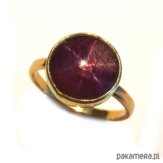 Szlachetny rubin gwiaździsty ze zjawiskiem asteryzmu sześcioramiennej gwiazdy, widocznym w słońcu lub świetle sztucznym typu halogen. Kamień oprawiony w złoto próby 585 (14 K),wspaniały kolor. srednica oprawy kamienia 10,8 x 11 mm. Ma 5,6 Ct. Rozmiar jubilerski 16, mogę wykonać powiększenie rozmiaru do max 17. Delikatna obrączka ma 3 mm szerokości. Waga 4.07 grama. Pierścionek sygnowany i ocechowany w urzędzie probierczym.Pierścionek zapakowany w ozdobne pudełeczko.