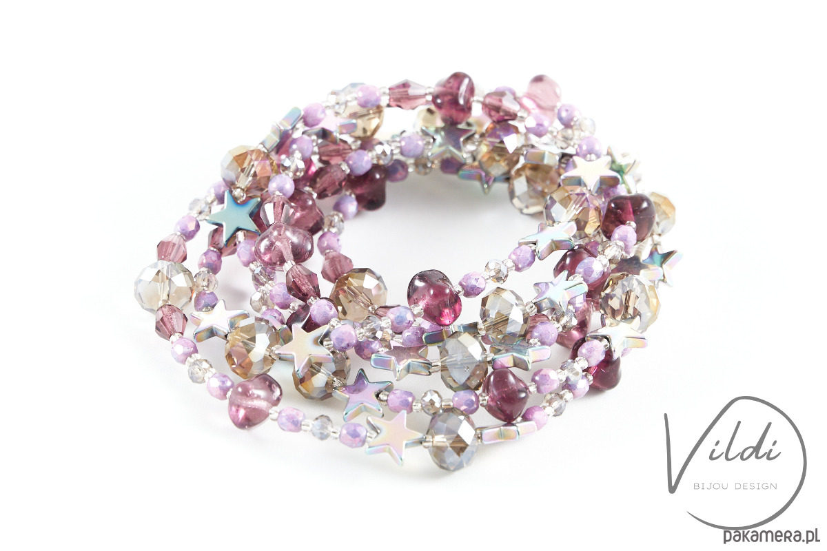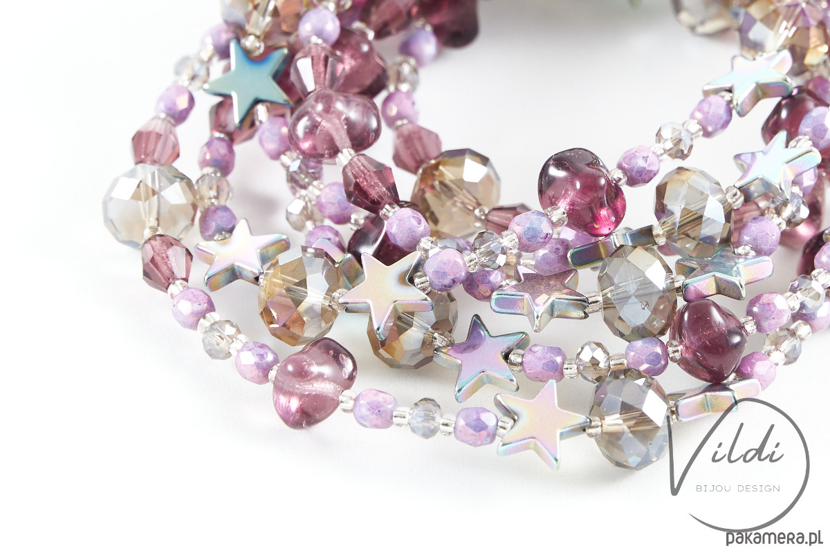 Metrowiec wykonany z linki jubilerskiej, elementów posrebrzanych, szklanych koralików, kryształków i gwiazdek. Obwód korali to ok 114cm! Posiada zapięcie.