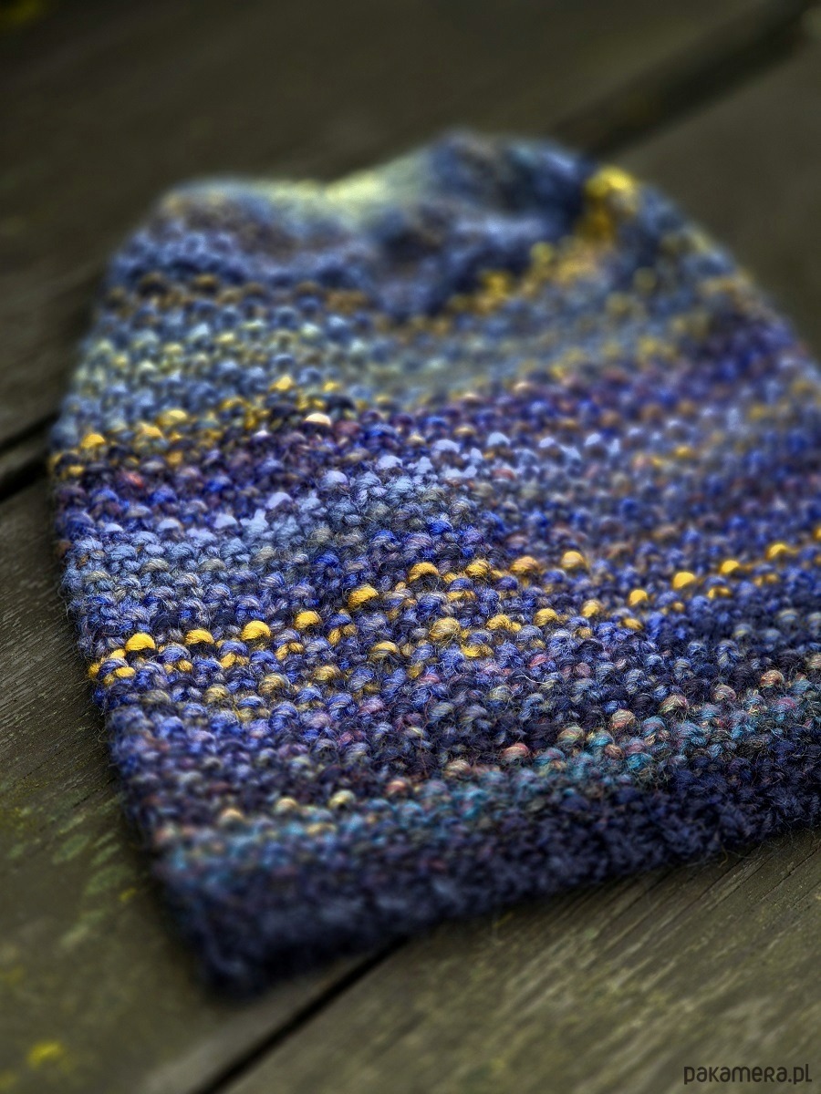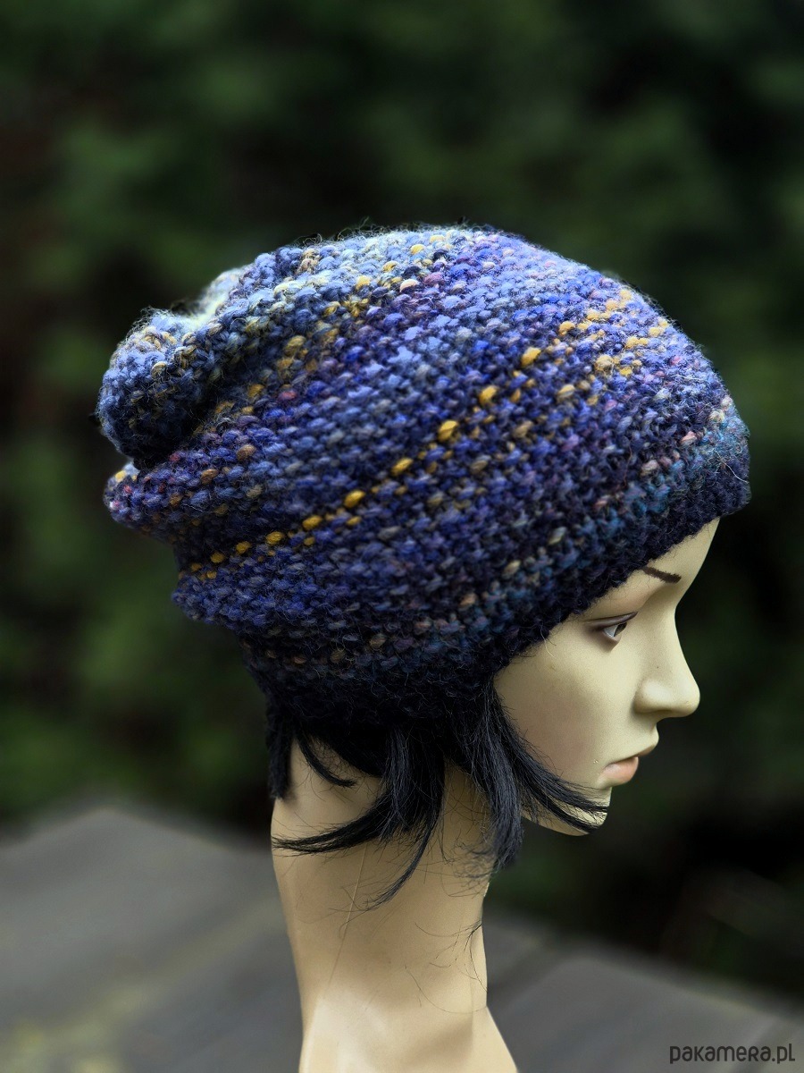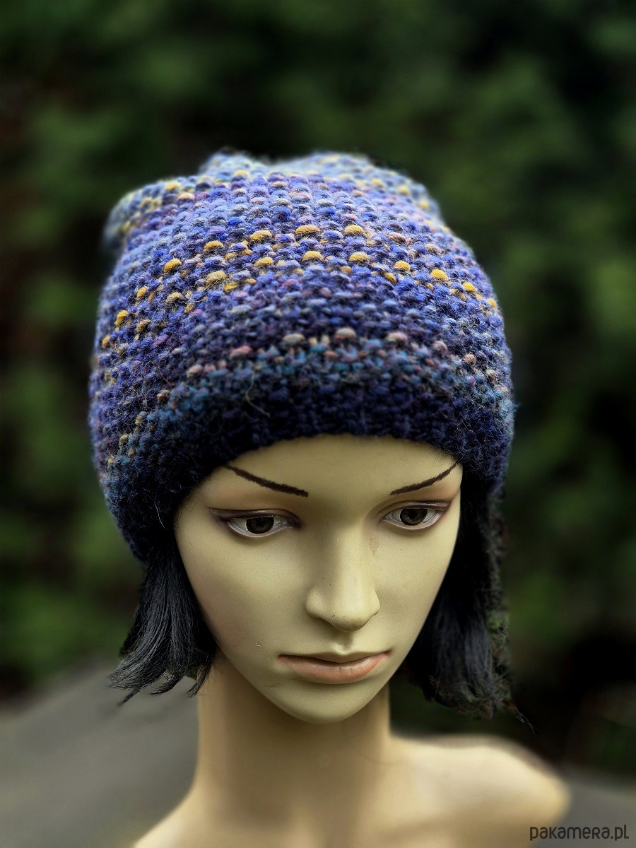 Ciepła i miękka czapa wykonana ręcznie na drutach z hiszpańskich włóczek w pięknym zestawieniu kolorystycznym (53% wełna, 47% akryl), przyjemna w dotyku. Czapka jest bezszwowa.