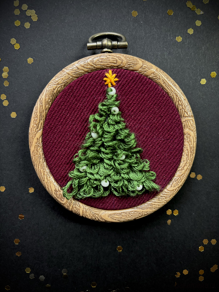 Choinka ma strukturalną fakturę, a w jej mulino-gałązki są wplecione szklane koraliki.