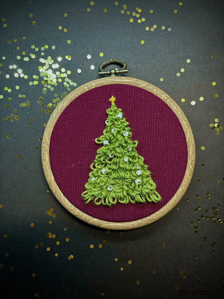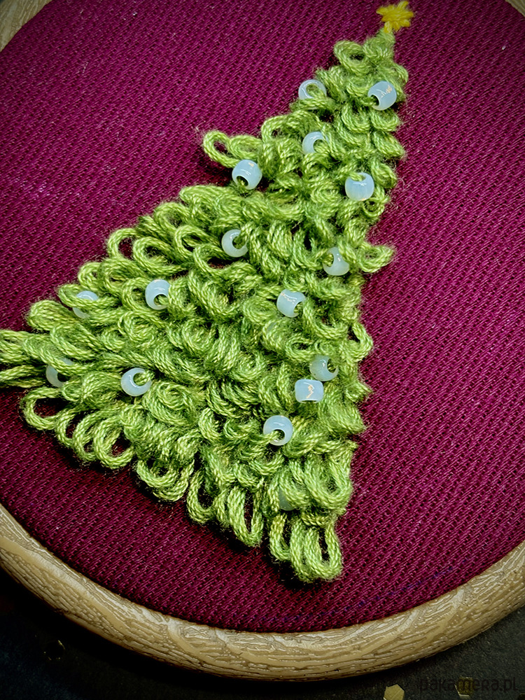 Choinka ma wplecione szklane koraliki w swoje nitkowe gałązki.