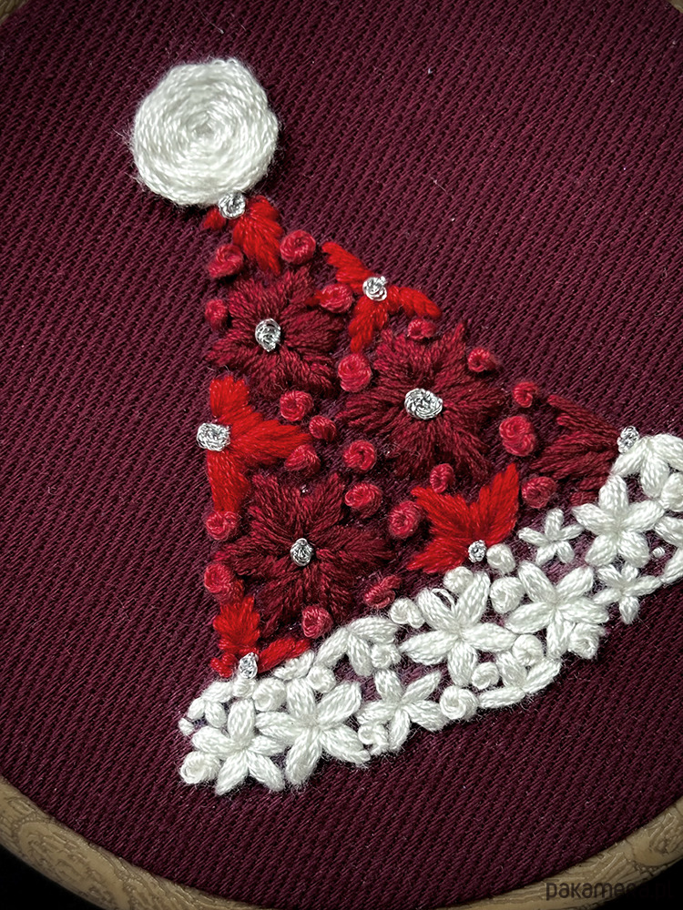 Czapka składa się z hafowanych kwiatów, okraszonych srebrną nicią.