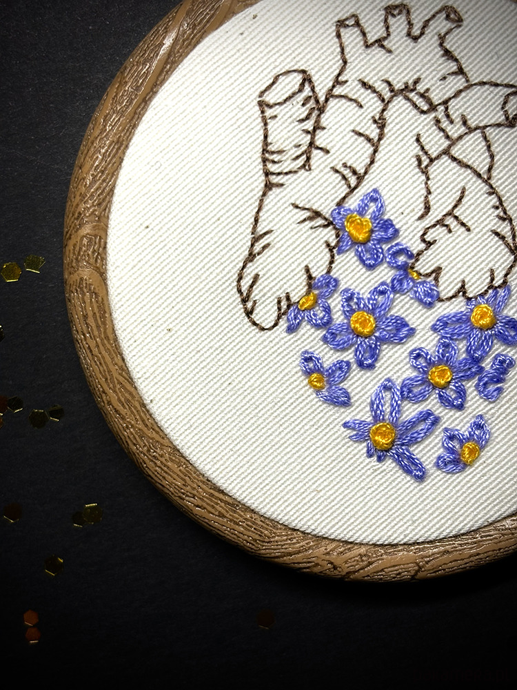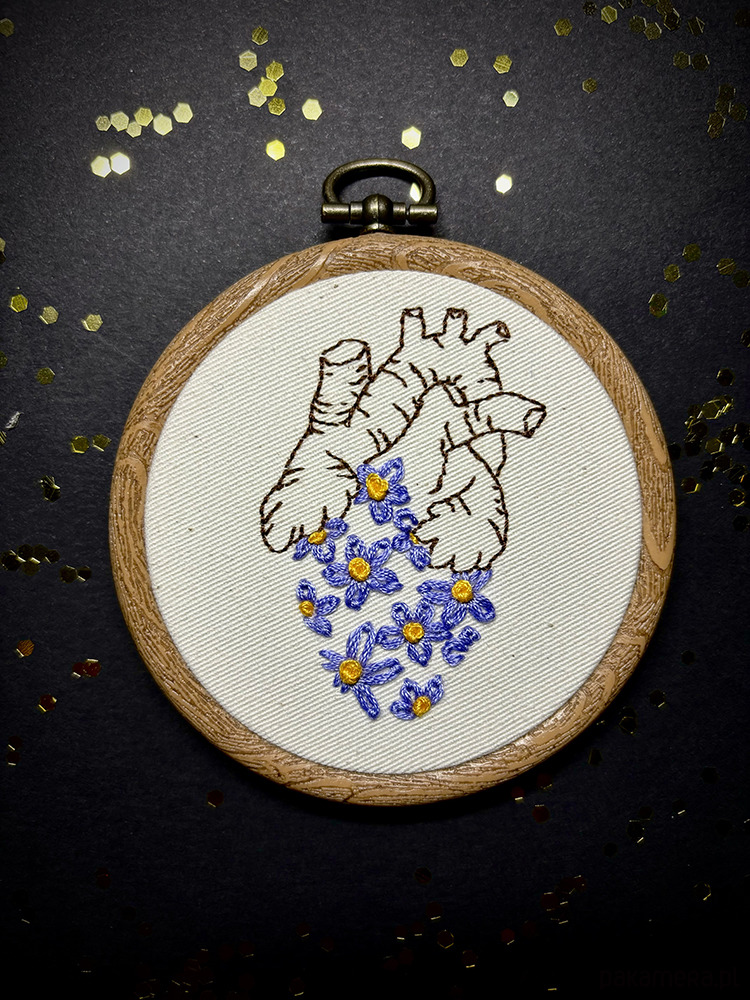 Ręcznie wykonany haft na bawełnianej tkaninie, oprawiony w ramkotamborek, gotowy do powieszenia w Twoim domu.