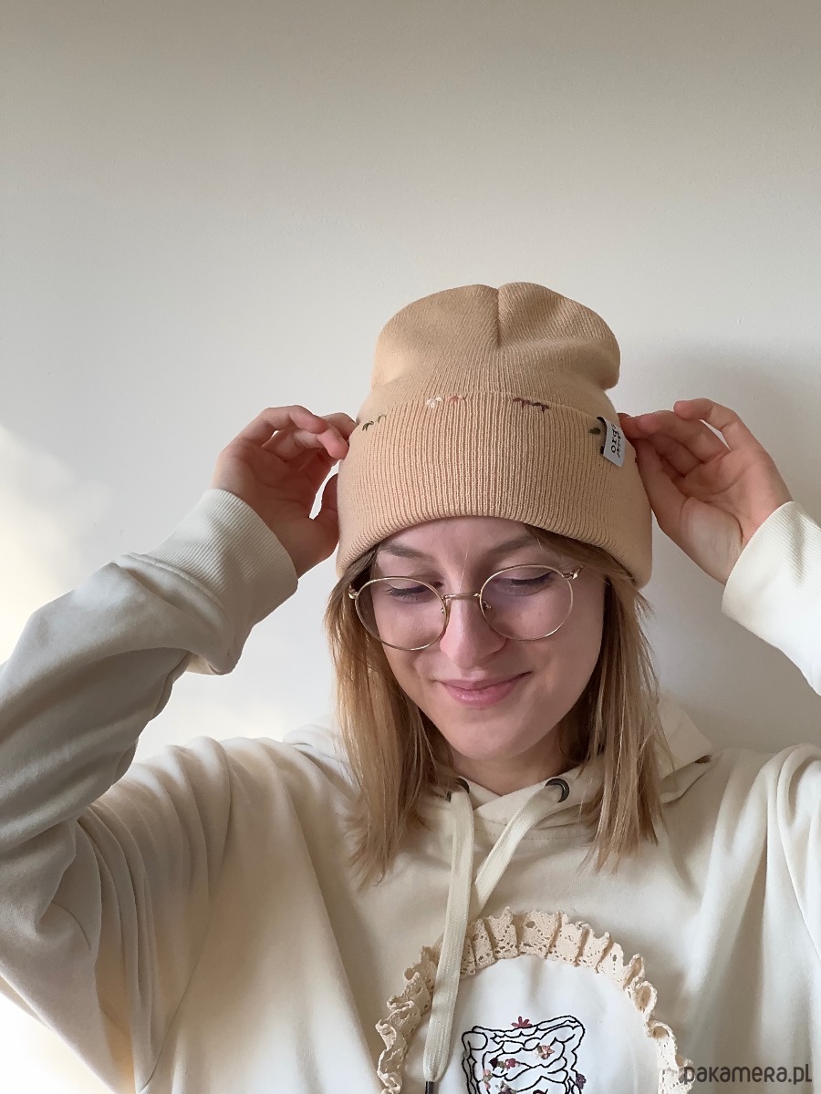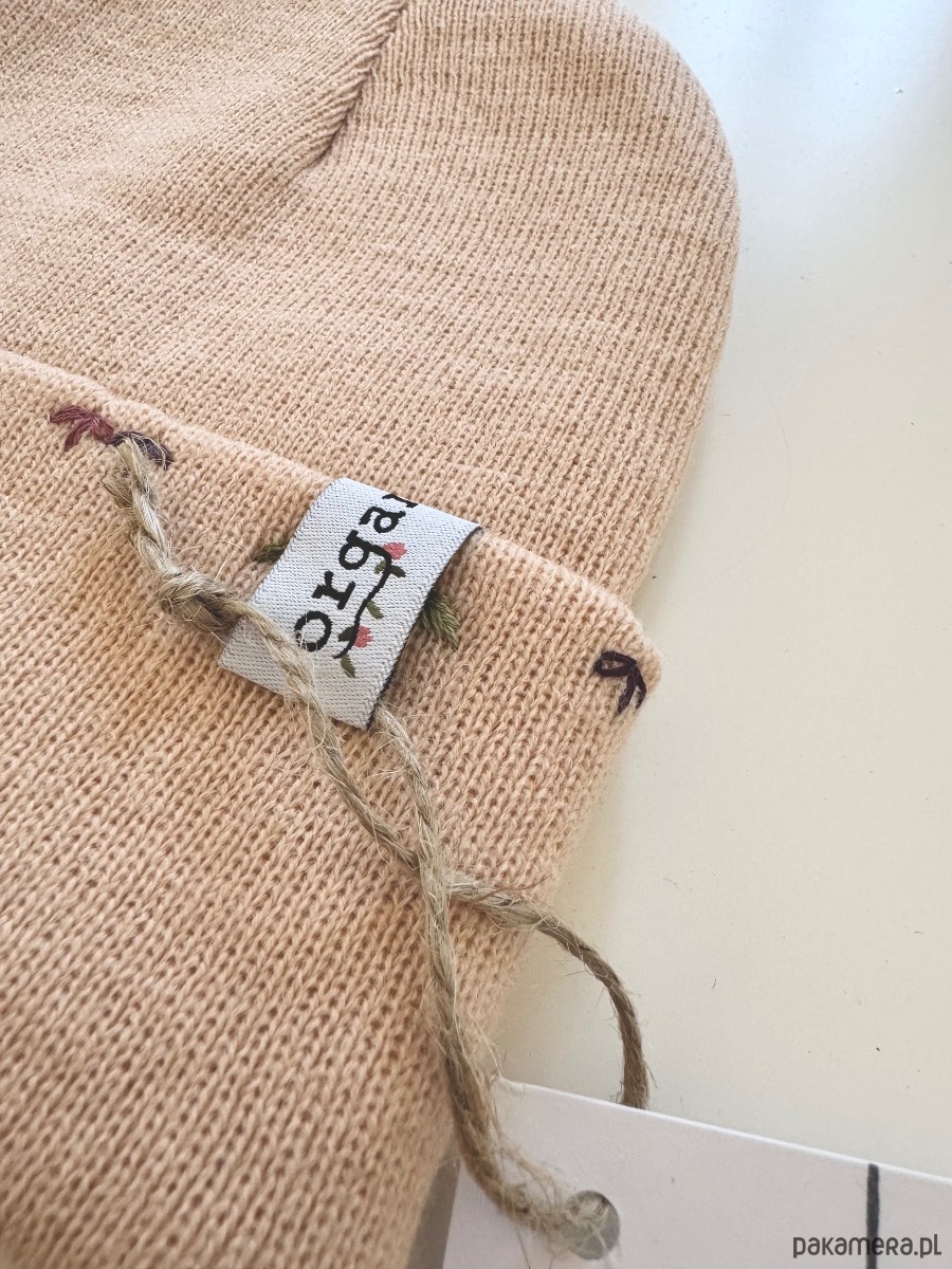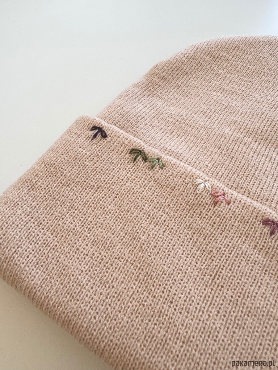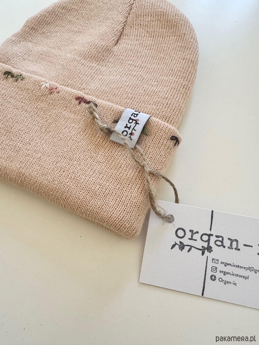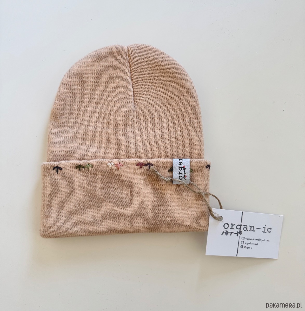 Czapka zimowa wykończona delikatnym haftem w pastelowych kolorach. Kolory czapek idealnie wpasowują się w kolorystykę wszystkich organ-icowych haftów.