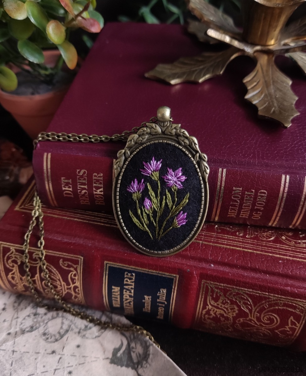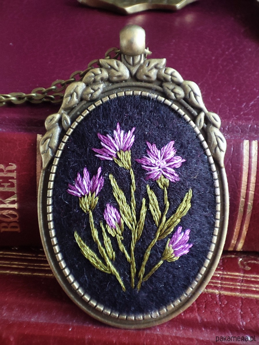 Haftowana biżuteria, vintage handmade jewelry, witchcore fairycore, whimsical, floral embroidered pendant habry bławatek kwiaty polne