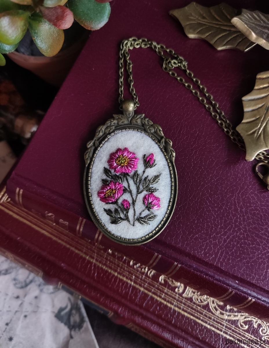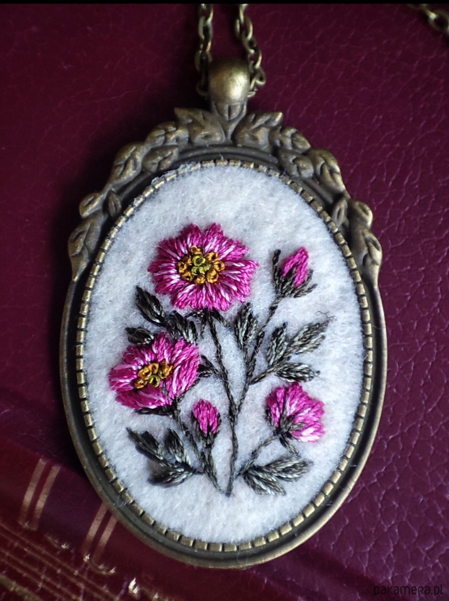 Haftowana biżuteria, vintage handmade jewelry, witchcore fairycore, whimsical, floral embroidered pendant, dzika róża kwiaty polne