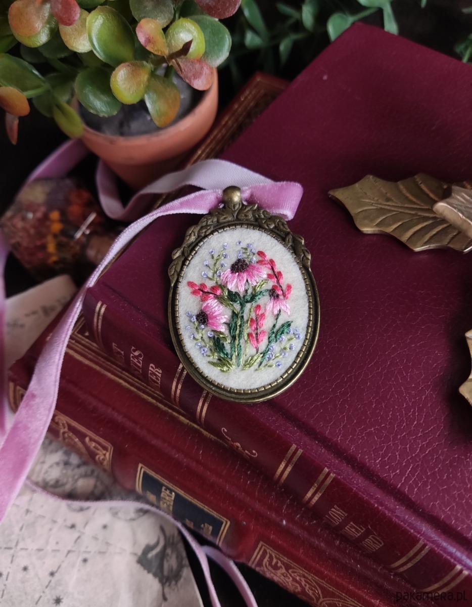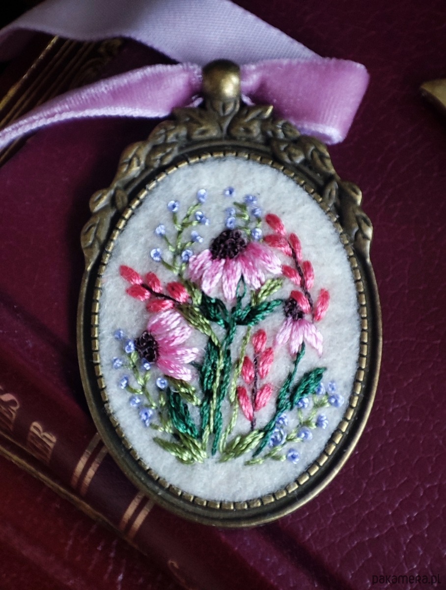 Haftowana biżuteria, vintage handmade jewelry, witchcore fairycore, whimsical, floral embroidered pendant bławatek kwiaty polne jeżówka